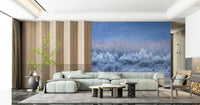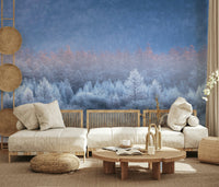 Bring the beauty of winter inside with this stunning vista. The design features a frosted forest bathed in the soft glow of dawn. A blend of blues, whites, and subtle peach hues create a calming visual. Use this wallpaper for walls to transform a bedroom or living room into a tranquil retreat. It also works well in an office, creating a peaceful and inspired work environment. The peaceful image complements many styles.