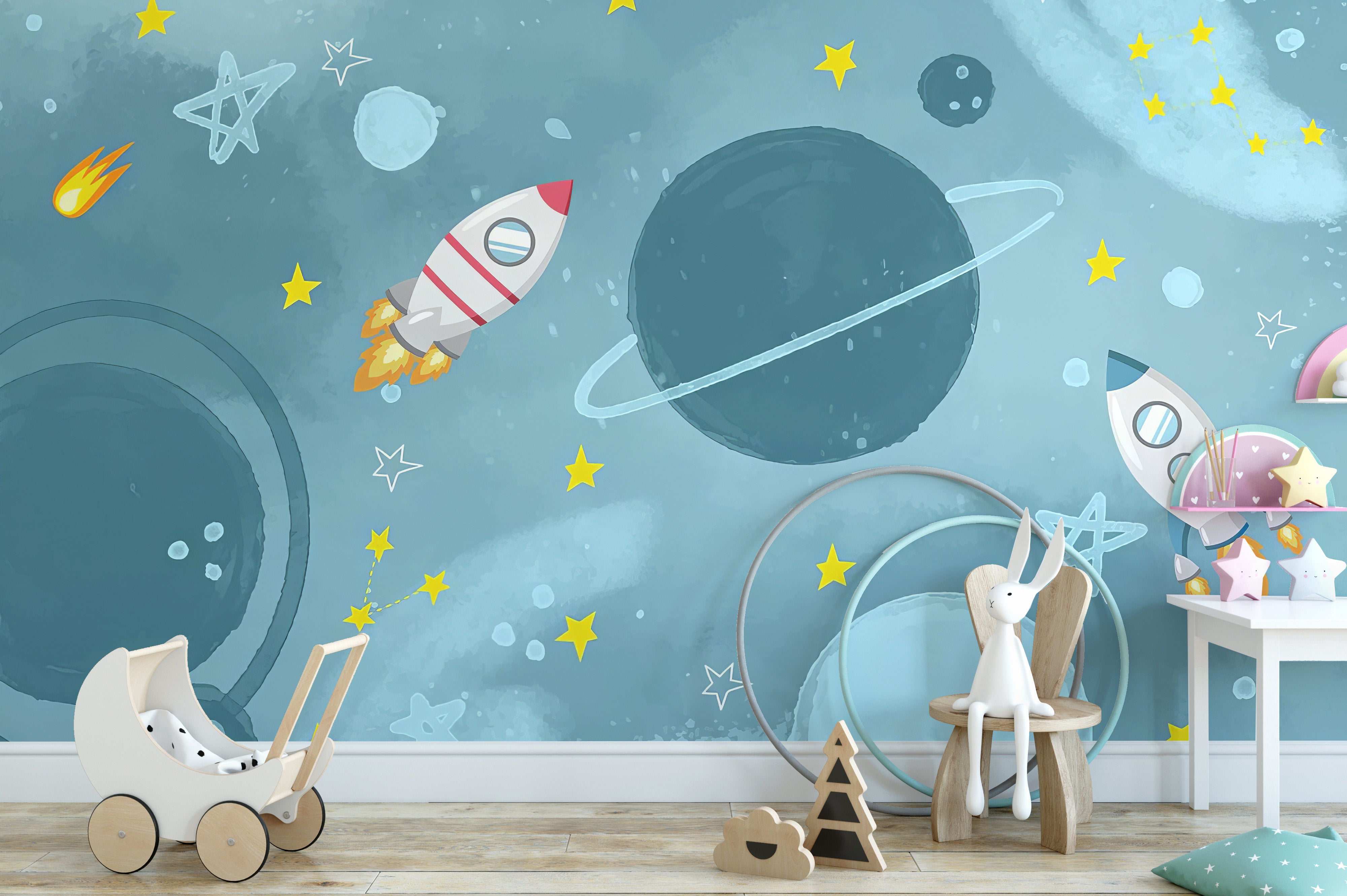 Blast off on a stellar quest with the galactic adventure wall mural. This captivating kids space wallpaper mural brings the universe's wonders to your little astronaut’s bedroom. Chart a course past swirling planets, shimmering stars, and sleek spacecraft. Each detail is crafted to spark curiosity and dreams of cosmic voyages. Perfect for playtime or bedtime, these walls inspire future space explorers. Let the galaxy be your child's playground!