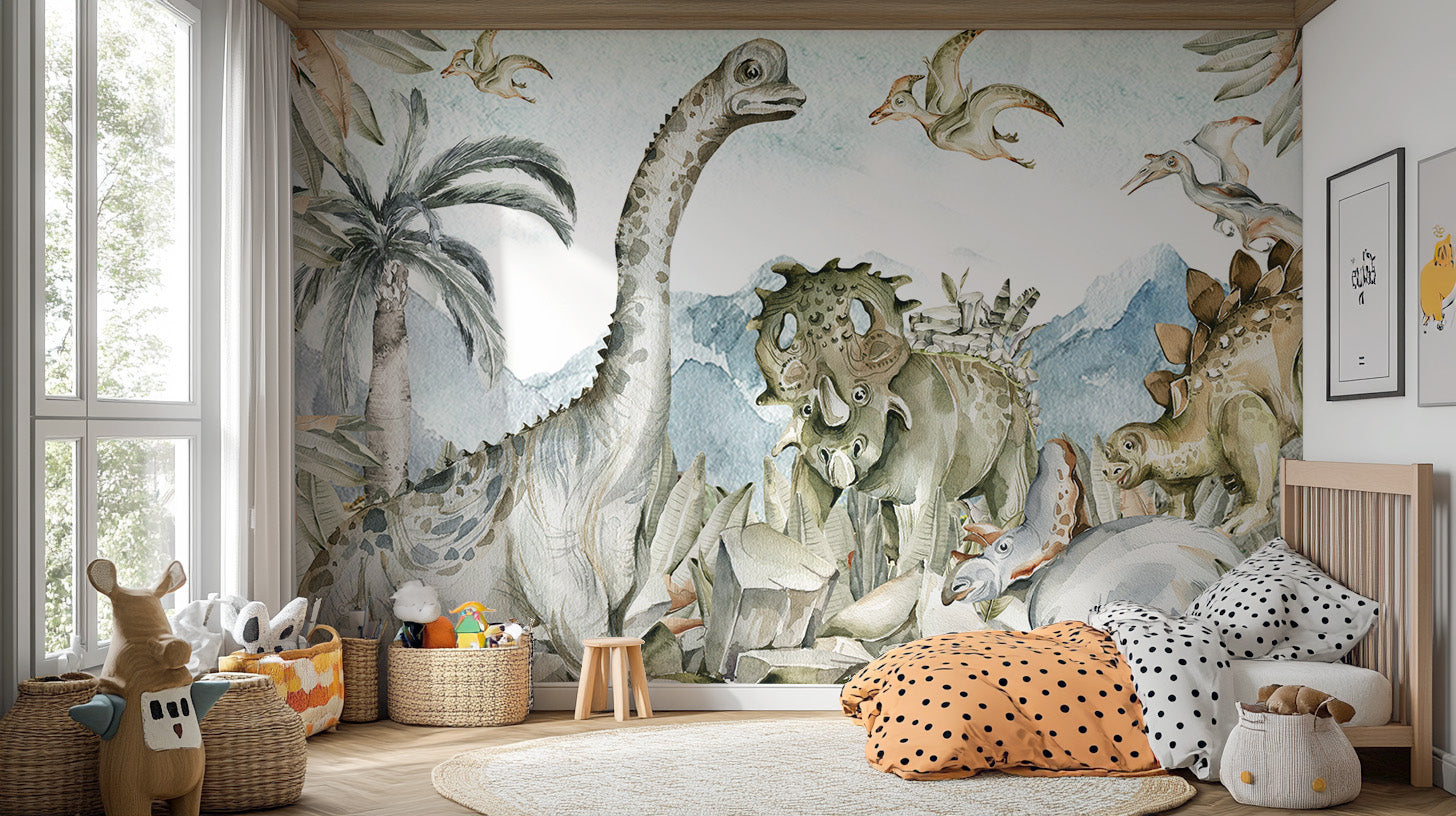 Immerse your child's imagination in a bygone era with gigantic guardians, the dinosaur, and an exquisite wallpaper design destined for their room. This enchanting print showcases a lively congregation of prehistoric giants, inviting a sense of adventure and discovery. Ideal for both nurseries and playrooms, this dinosaur wallpaper is a visual feast featuring rich details that spark curiosity and storytelling. Every glance reveals a new aspect of the ancient world, from the towering brachiosaurus to the armor-clad stegosaurus, making it a perfect backdrop for young explorers. Watch as this nursery wallpaper becomes a conversation piece, igniting a passion for history and the natural world in the hearts of children. With gigantic guardians of the dinosaurs, your little one's room will become a portal to the age of dinosaurs, where every day is an epic journey.
