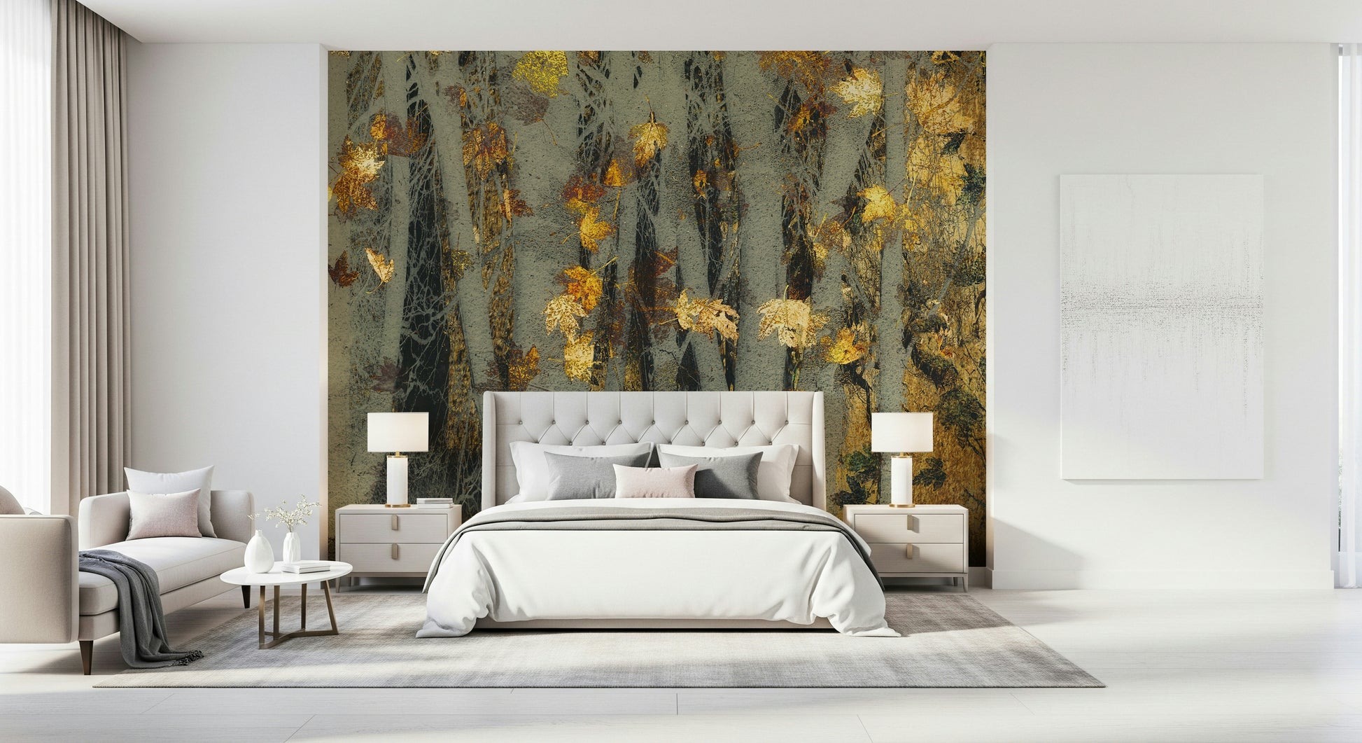Transform your living space with this stunning wallpaper for walls. It showcases an abstract woodland scene featuring golden autumn leaves scattered among the trees. The neutral gray backdrop creates a soothing effect. This design infuses warmth and a touch of nature into any room. Perfect for living rooms, bedrooms, or hallways, this wallpaper complements modern, rustic, and minimalist interiors, creating a cozy and inviting atmosphere.