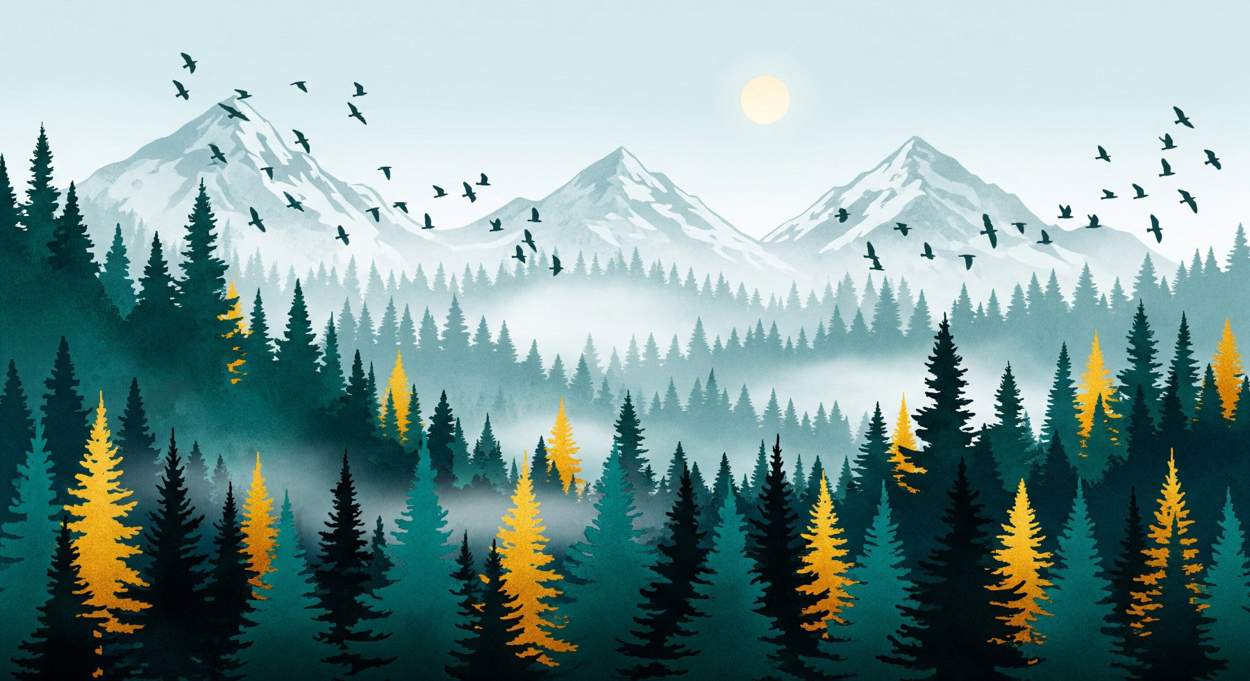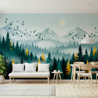 Elevate your interior with this stunning landscape, bringing the beauty of nature indoors with this stylized forest wallpaper for walls. Towering pine trees in muted greens and teals create a lush foreground, as striking gold accents highlight select trees and draw the eye. The misty mountains and flock of birds in the distance create a sense of depth and serenity. This design works well in living rooms, bedrooms, or even hallways, offering a tranquil backdrop that will enhance the ambiance of your home. Transform ordinary spaces into tranquil retreats with this unique and captivating artwork.