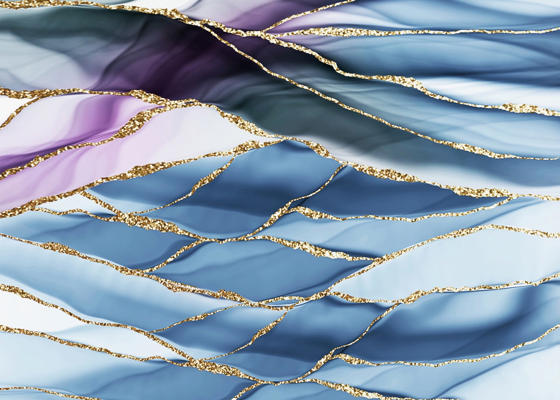 Transform your space with this elegant, flowing wallpaper. The design features soft blue and purple hues, layered to create a gentle, wave-like effect. Glimmering gold accents highlight the contours, adding a touch of luxury. This wallpaper for walls is ideal for bedrooms, living rooms, or dining areas. It introduces a serene and sophisticated atmosphere. The subtle color palette ensures it complements many interior styles.