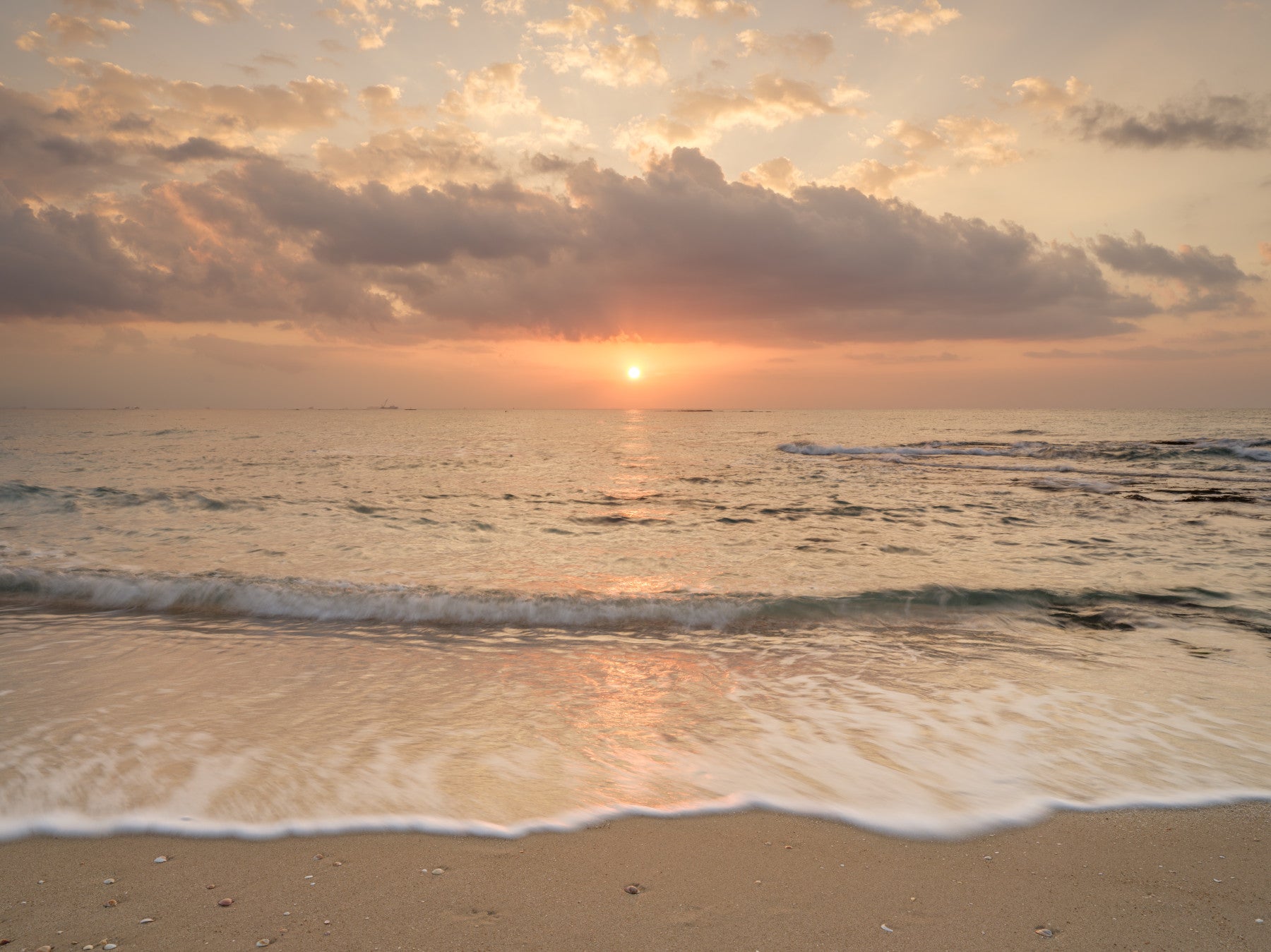 Beach Sunset. Bathe your space in the warm glow of dawn. This serene beach scene captures the sun's first light kissing the water's edge. Delicate foam lines the shore, meeting the sand with a soft embrace. The sky blends peach and gold, creating a tranquil, inviting ambiance. This wallpaper for walls enhances bedrooms, living rooms, or any space that needs a touch of calm. Let this soothing scene transform your interiors into a coastal retreat.
