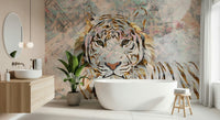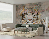 Transform your space with this unique tiger design. Featuring a striking gold leaf effect against a collage background, this wallpaper for walls adds a luxurious touch. Soft peach, gray and gold accents make it a versatile choice for living rooms or bedrooms. The design balances urban edge with animal beauty, creating a focal point that elevates decor. It offers a fusion of modern art and wildlife portraiture.