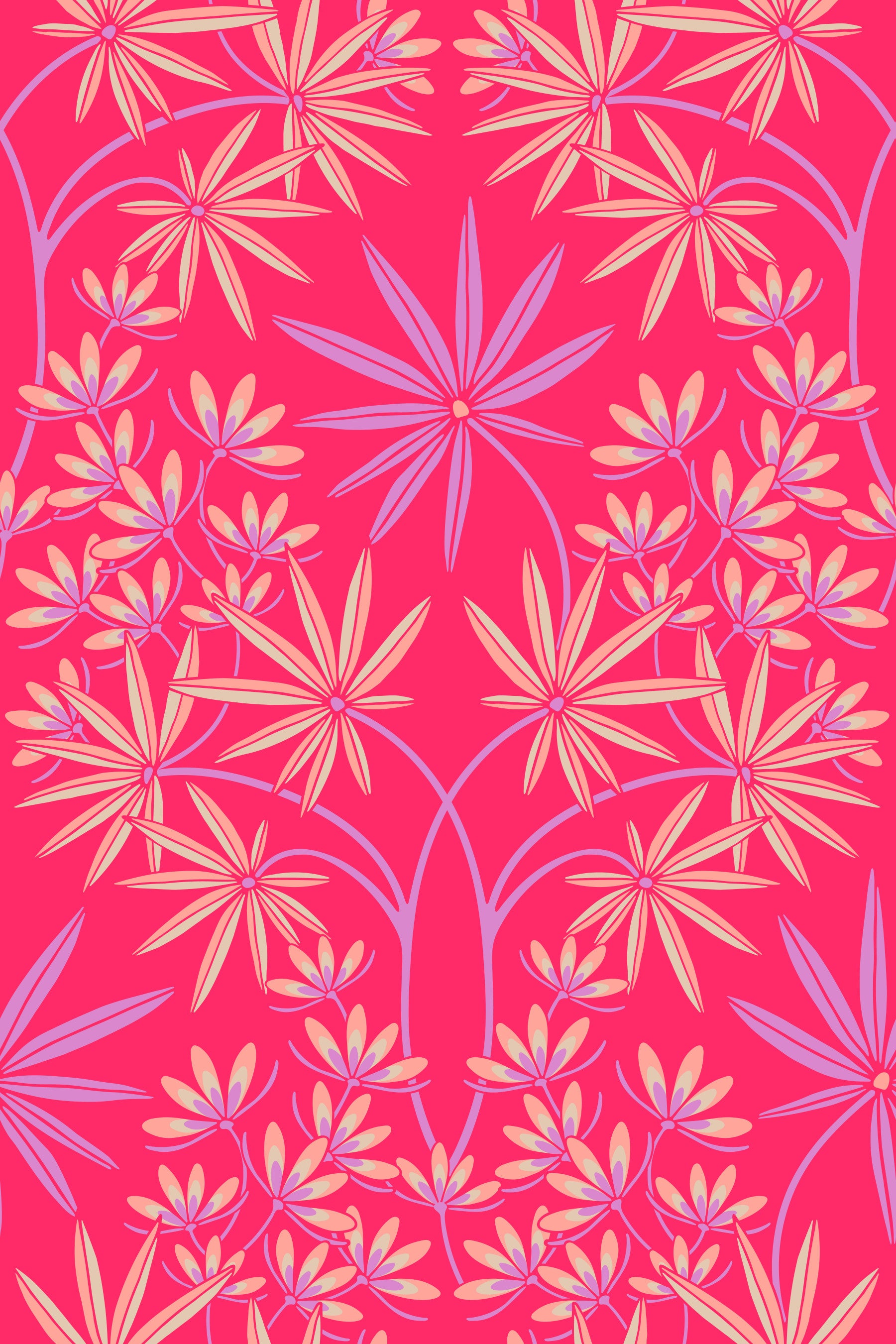 Immerse yourself in the gorgeous opulent world of this Glamour floral damask wallpaper in a Fuchsia Hot Pink colourway reminiscent of Old Hollywood. This floral tropical botanical pattern is an unapologetic celebration of Maximalism, referencing both Art Nouveau and opulent Jazz Age style, featuring blush, cream and lilac purple flowers and tropical leaves on a fuchsia hot pink background in a delicate lacy damask layout. The symmetrical arrangement creates a sense of formal elegance, typical of damask patterns, with an exaggerated scale and exuberant color palette that is perfect for adding a touch of high-fashion drama to any space. This pattern design is also available in Other Colourways too! Original wallpaper pattern design by Jackie Tahara of UnBlink Studio.
