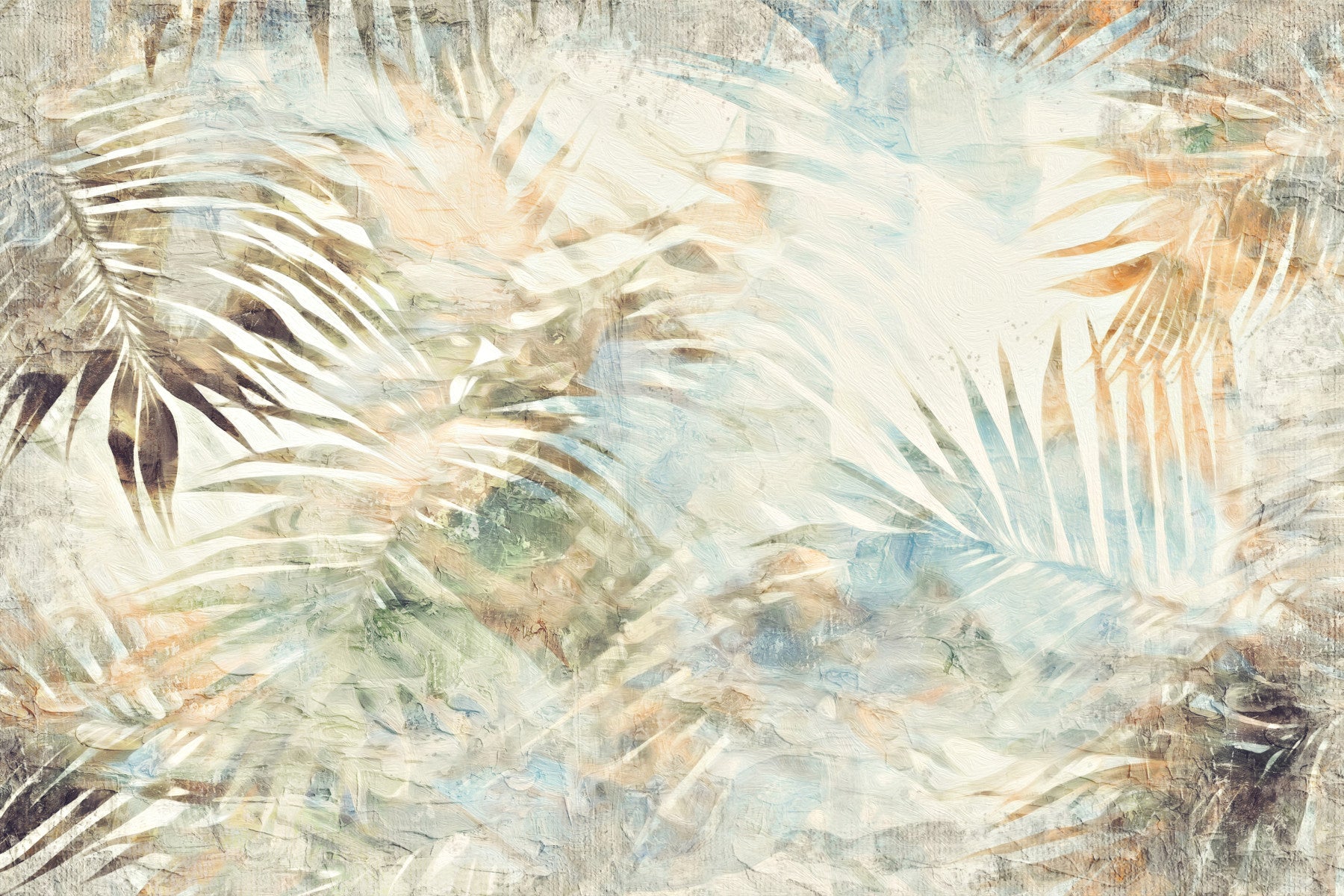 Bring a touch of the tropics to your home with this elegant palm leaf design. Delicate brushstrokes create a textured, painterly effect. Soft blues, greens, and browns blend to form a relaxing color palette. Install this wallpaper for walls in bedrooms, living rooms, or hallways to add a touch of sophistication. The subtle color variations and artistic style easily complement modern and traditional decor.