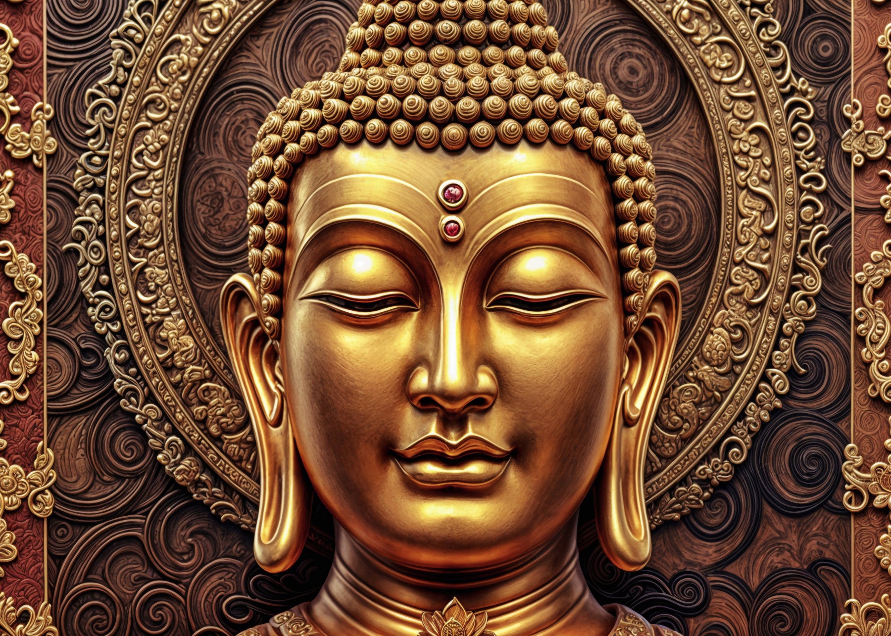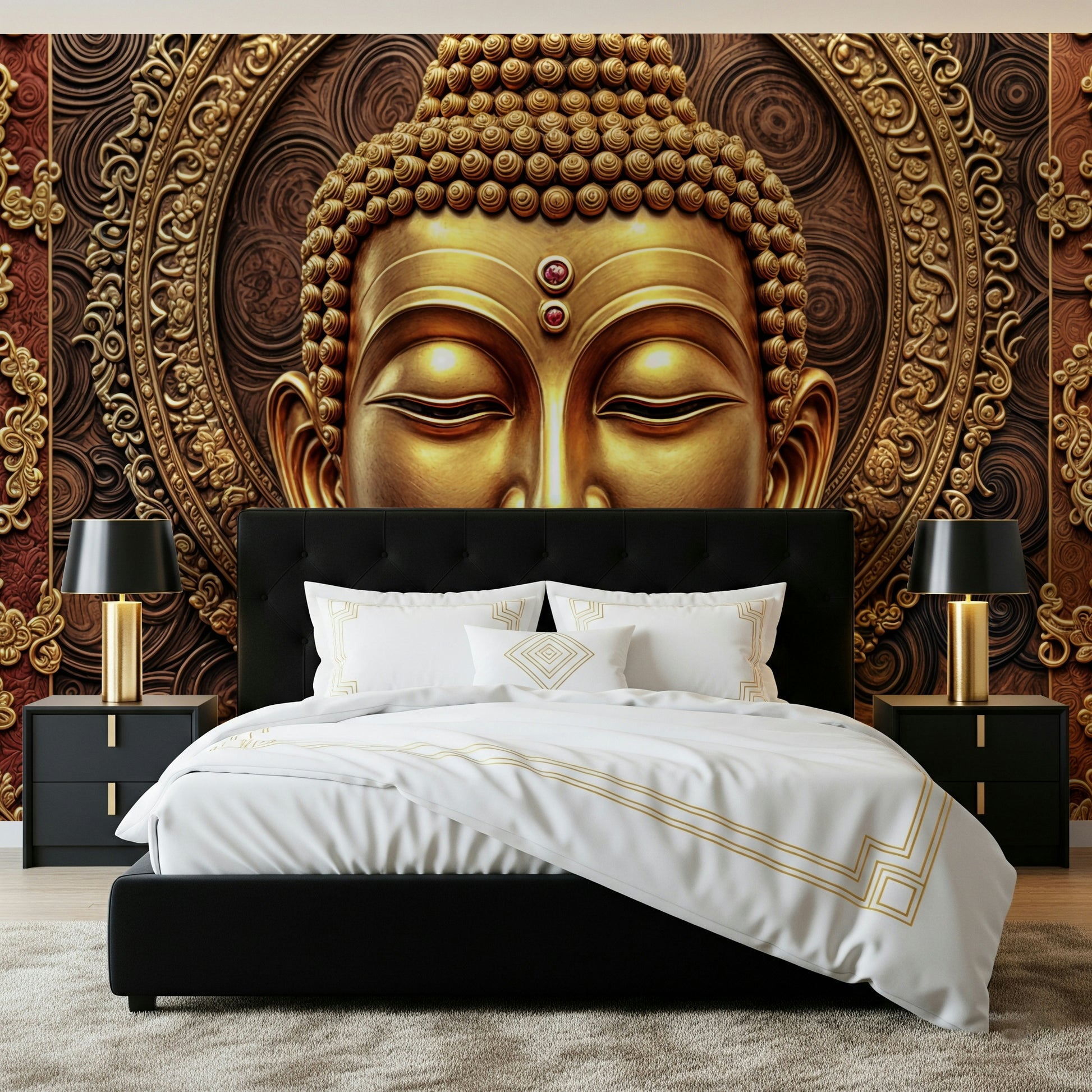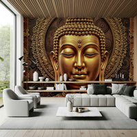Invite tranquility with this stunning Golden Buddha wallpaper. The intricate detailing and rich golden tones create a luxurious and calming atmosphere. Three ruby stones adorn the forehead. With it´s complex circle, It´s suitable for walls in meditation rooms, living rooms, or even bedrooms, bringing a sense of peace and serenity. This wallpaper for walls enhances interiors with its spiritual elegance and refined aesthetic, creating a sanctuary within your home.