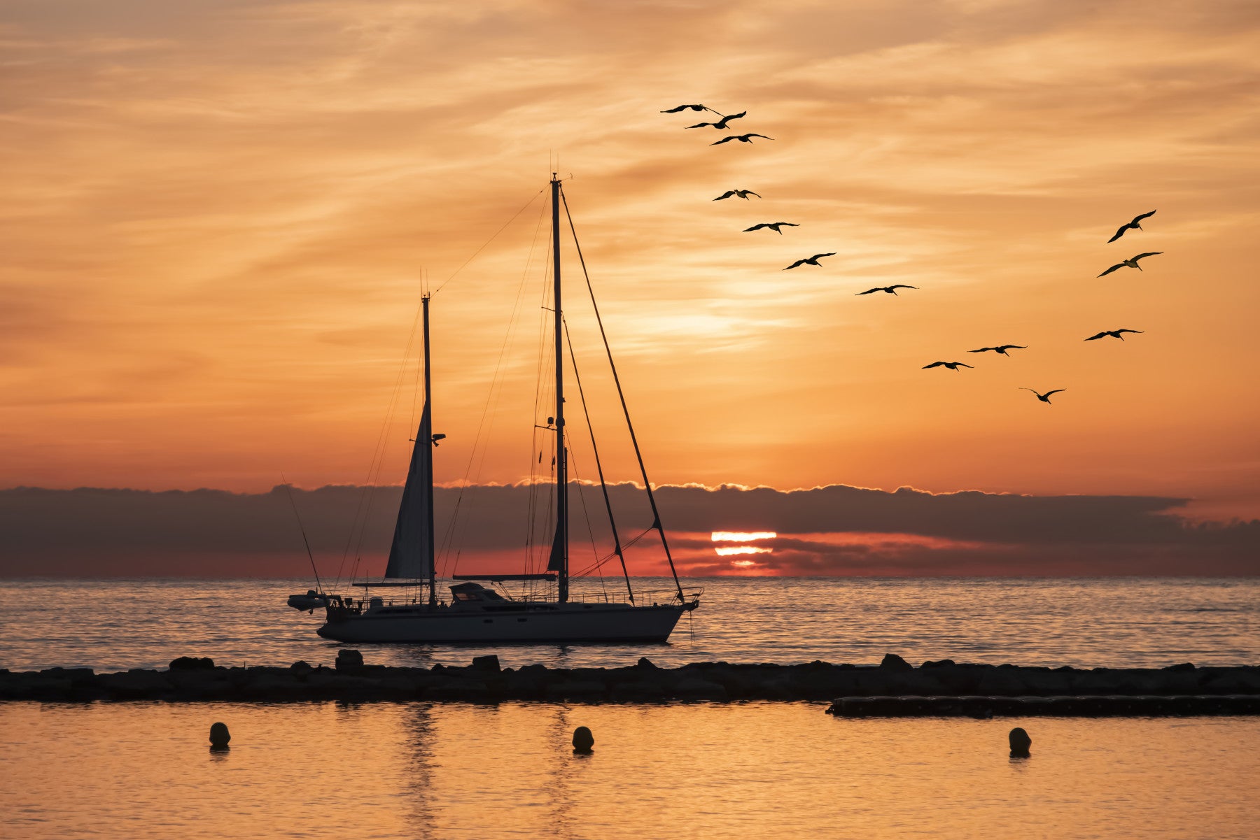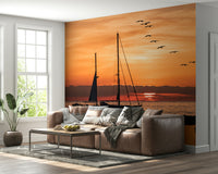 Transform your space with this breathtaking wallpaper for walls. The scene presents a sailing yacht poised against a horizon bathed in golden light. Silhouetted birds add a touch of nature's artistry. The warm, inviting tones create a relaxed atmosphere for many rooms. This design will particularly enrich a bedroom or a cozy reading nook, where it adds a scenic view that promotes relaxation and serenity, blending perfectly with a minimalist or modern interior.