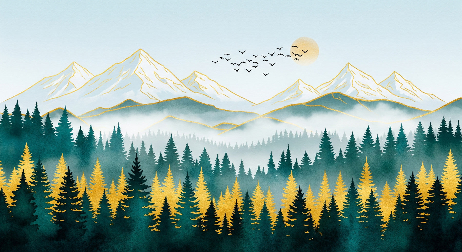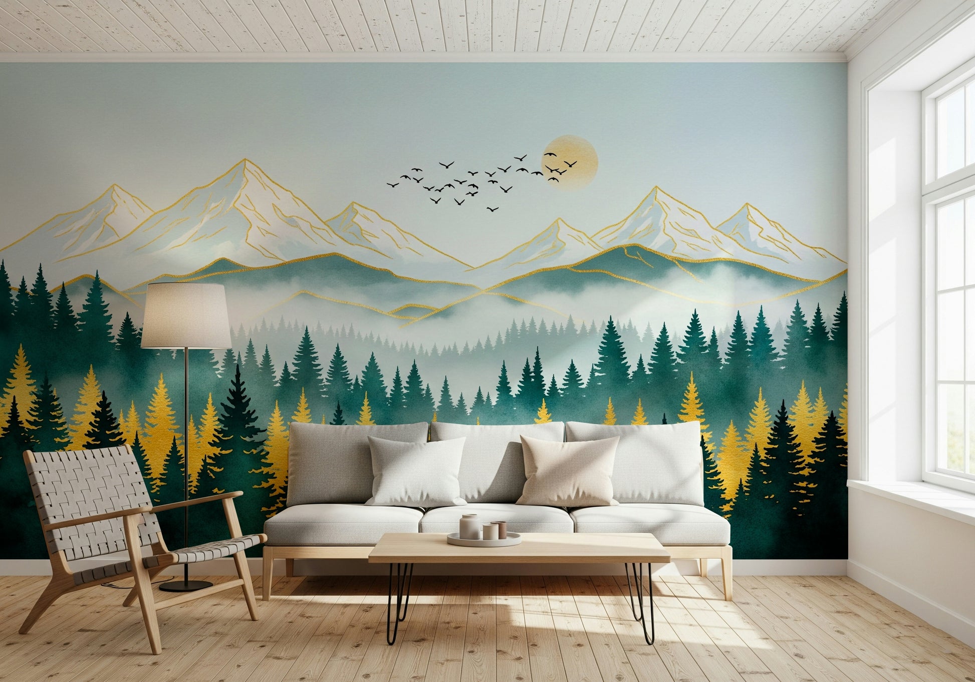 Elevate your interior design with this stunning mountain and forest wallpaper. This wallpaper for walls presents a serene landscape, featuring golden trees against a muted, light-blue sky and gold-edged peaks. It brings a touch of natural beauty and quiet sophistication to any room. This design works wonderfully in bedrooms for a peaceful retreat, or in living spaces as an impressive accent. The subtle palette complements modern, minimalist, or even bohemian decor. Install this wall décor and transform your space into a tranquil sanctuary.