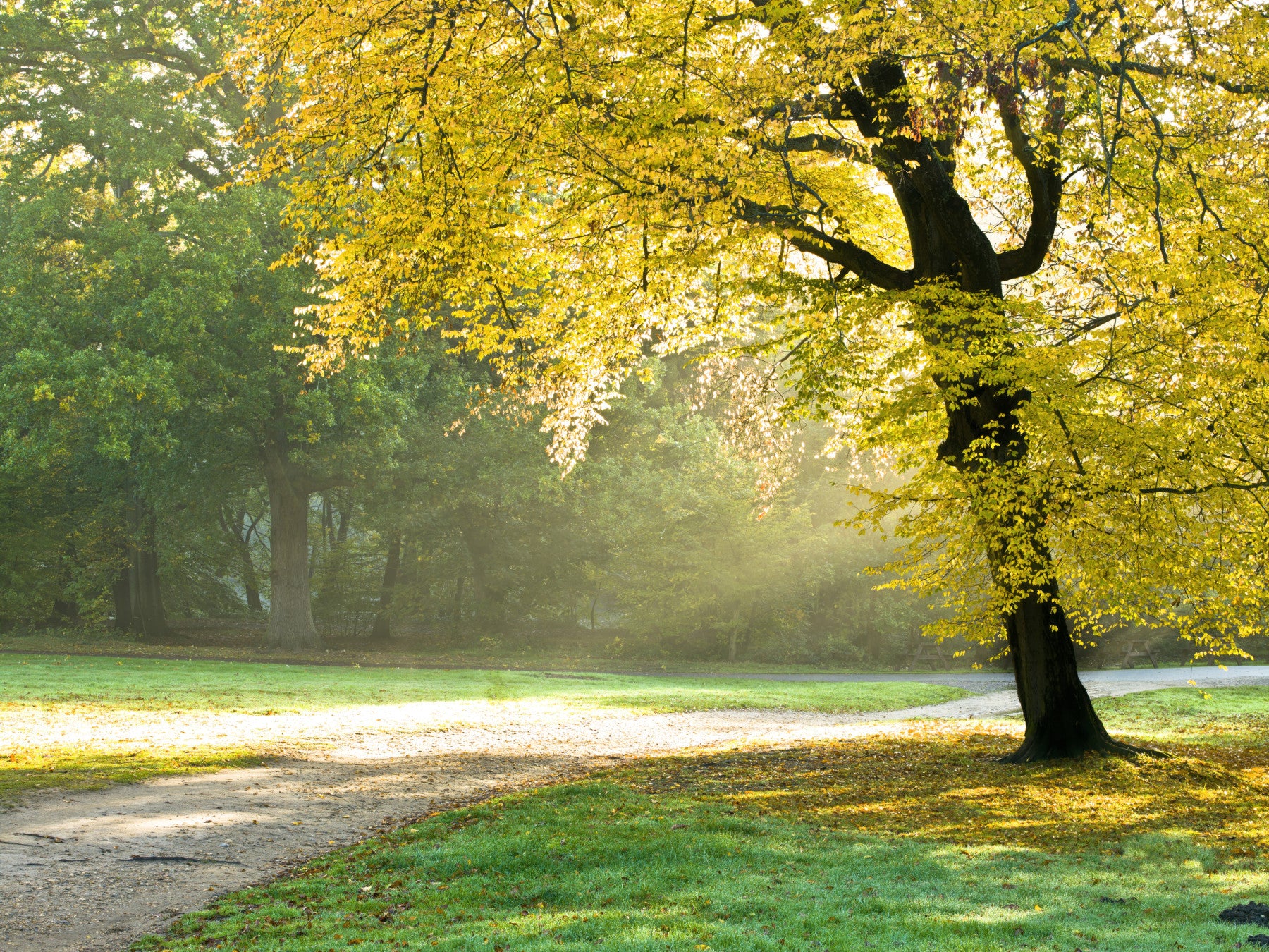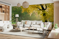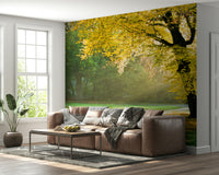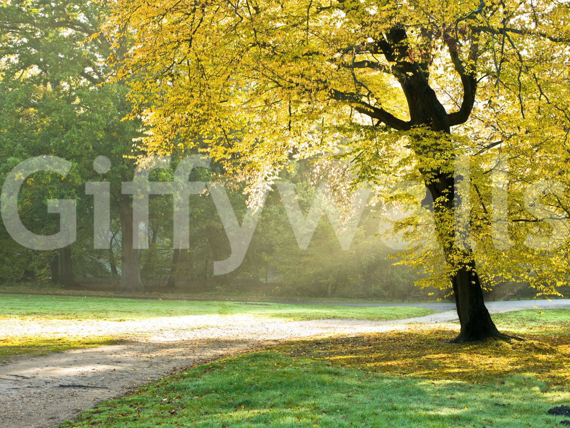 Autumn tree in sunlight. Immerse yourself in the warm embrace of "Golden Radiance," a captivating piece of wall décor that evokes the serene beauty of an autumn morning. This artwork showcases a majestic tree, its canopy ablaze with leaves painted in hues of brilliant gold, radiating a soft, ethereal light. The sunlight filters through the foliage, creating a mesmerizing dance of light and shadow on the lush green meadow below. A tranquil path winds its way through the landscape, inviting you to step into this peaceful sanctuary. "Golden Radiance" brings a sense of warmth, tranquility, and natural beauty to any room. Elevate your living space with this radiant vista, capturing the essence of autumn's fleeting, golden moments, infusing your surroundings with a sense of serenity and natural splendor.