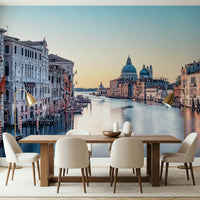 Invite a serene escape into your home with this cityscape scene. This wallpaper for walls captures the timeless beauty of Venice's Grand Canal at dawn. Gentle light bathes the historic buildings, creating a soft, inviting mood. The tranquil waterway reflects the sky, amplifying the sense of calm. With its muted color palette and classic architectural design, this wallpaper suits a dining room or home office, providing a sophisticated backdrop. It enhances the perception of depth, making smaller rooms feel more spacious and lends a touch of Old World charm to any interior.