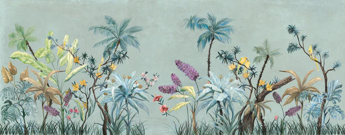 Artistic boho flowers wallpaper with soft green undertones.