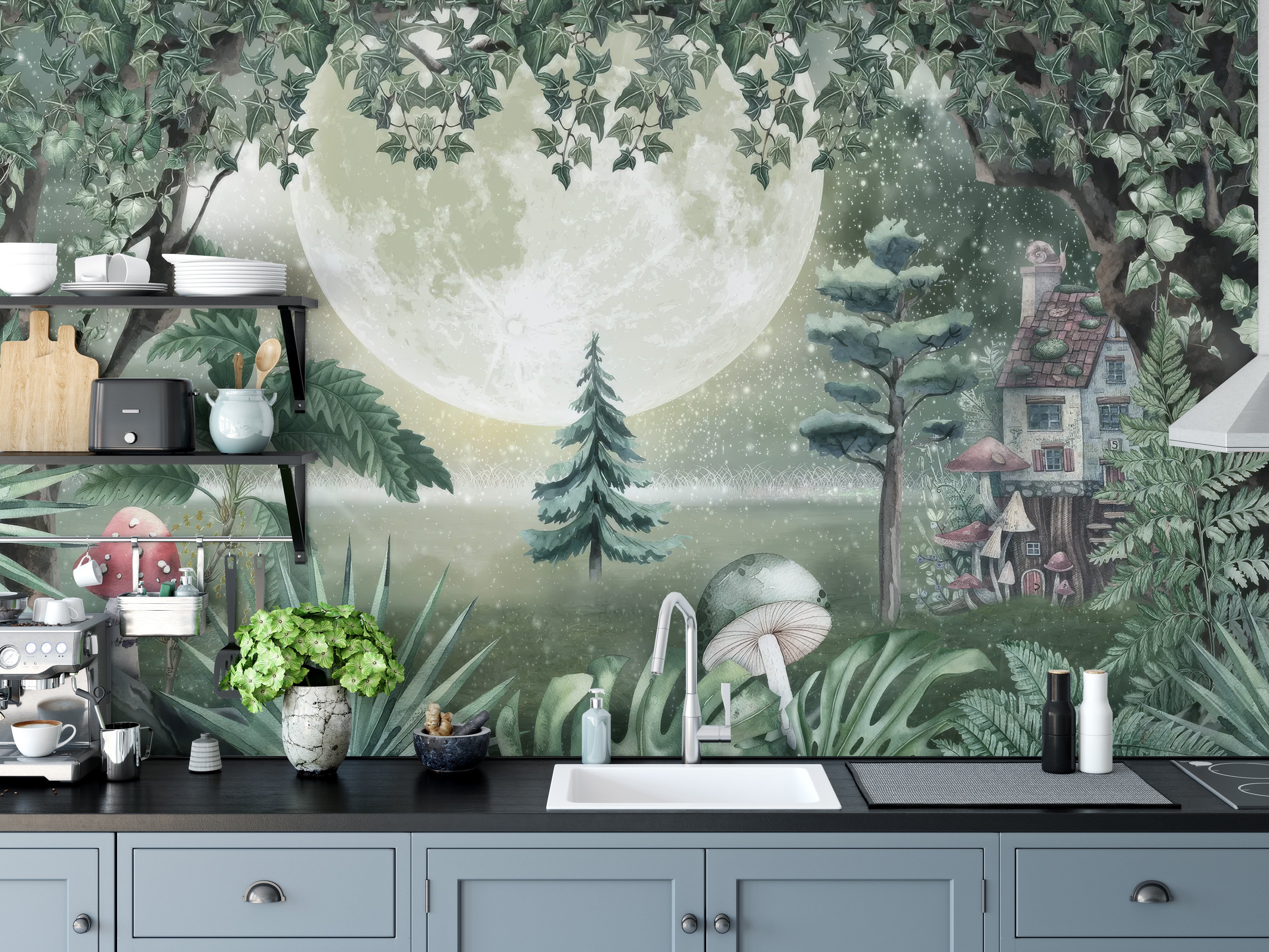 Surround your children with the lush, vibrant scenery of our kids wallpaper featuring a green magical night forest wall mural. Let them wake to the sight of towering trees and a moon that bathes their room in a gentle glow. This isn’t just a background, it's a wallpaper for their imagination. Here, fairy tales come to life, and every day is an invitation to explore a world brimming with wonder. Gift them a mural that's more than just a visual treat, it's a springboard for creativity and a haven for daydreams. Every inch is crafted to spark joy and wonder in the hearts of young explorers.