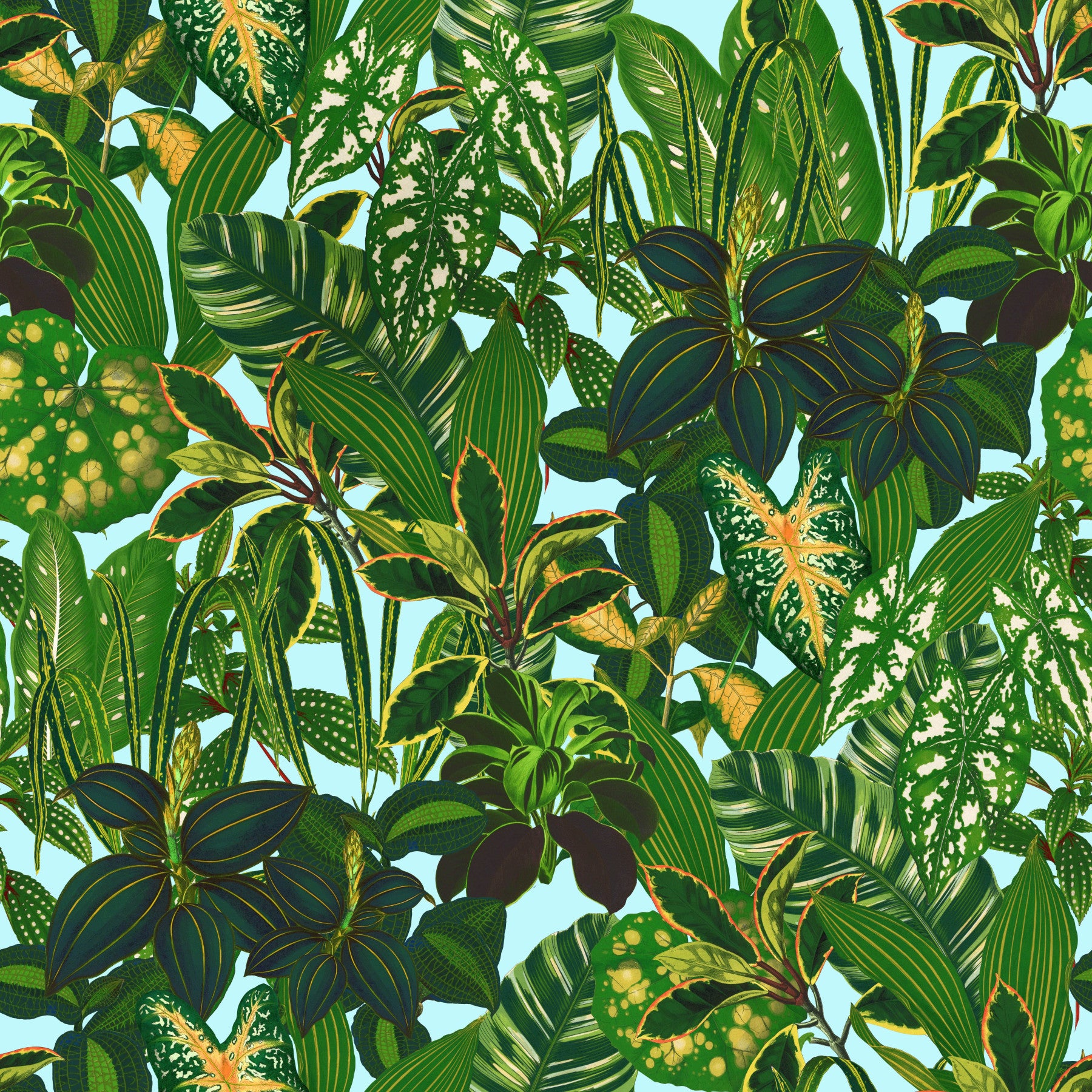 Bring a vibrant jungle atmosphere to your space with this dense leaf pattern. The design features various tropical plants. Shades of green on a light blue backdrop create a refreshing atmosphere. Install this wallpaper for walls in a living room, bedroom, or entryway to make a statement. The natural style offers a serene backdrop. Its rich detail will bring excitement to any space. It complements modern interiors or bright and airy interiors.