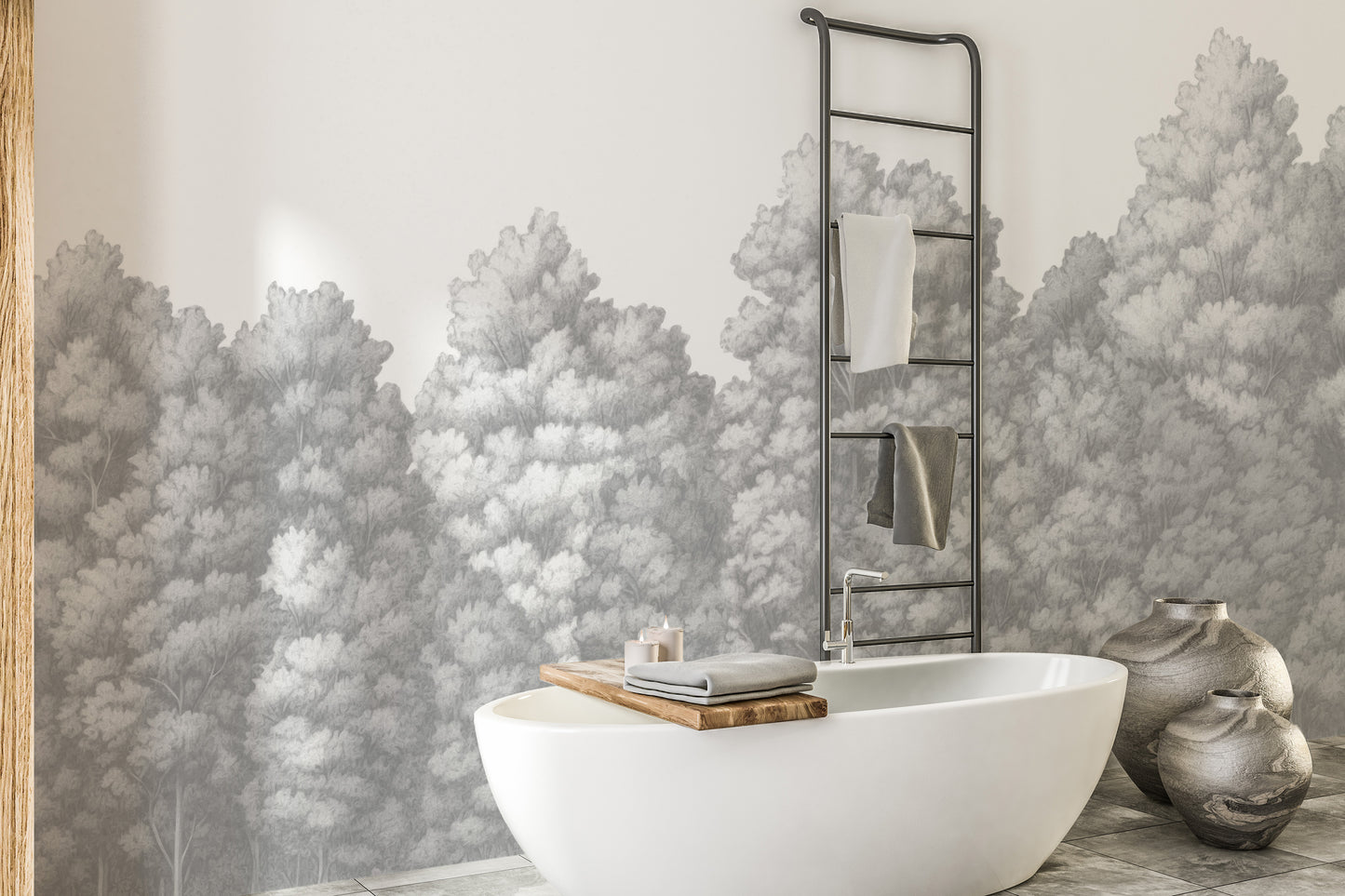 Neutral grey forest wallpaper with trees