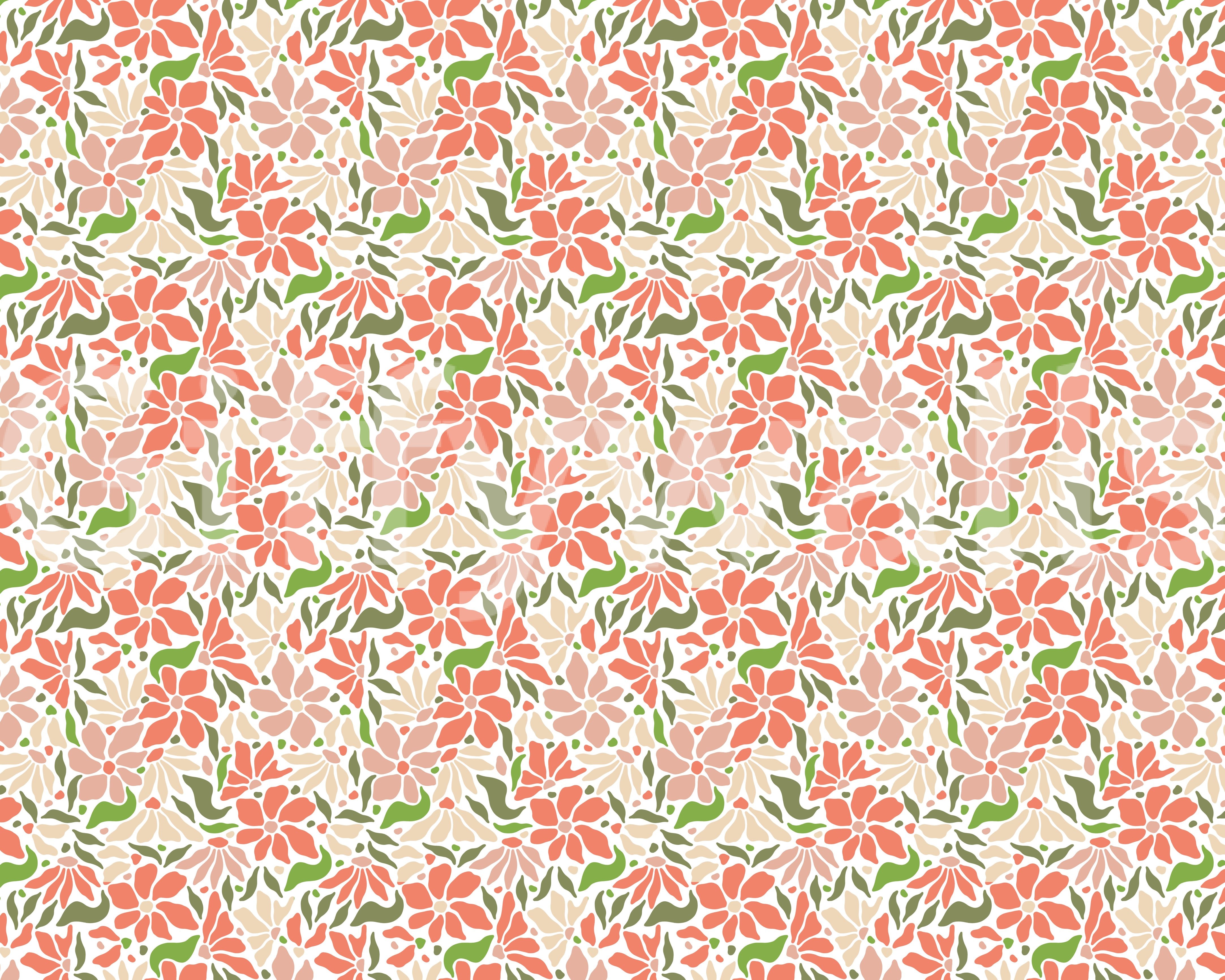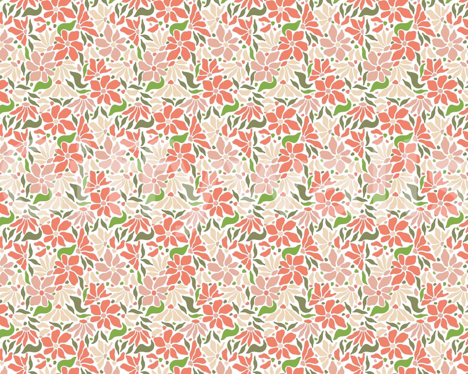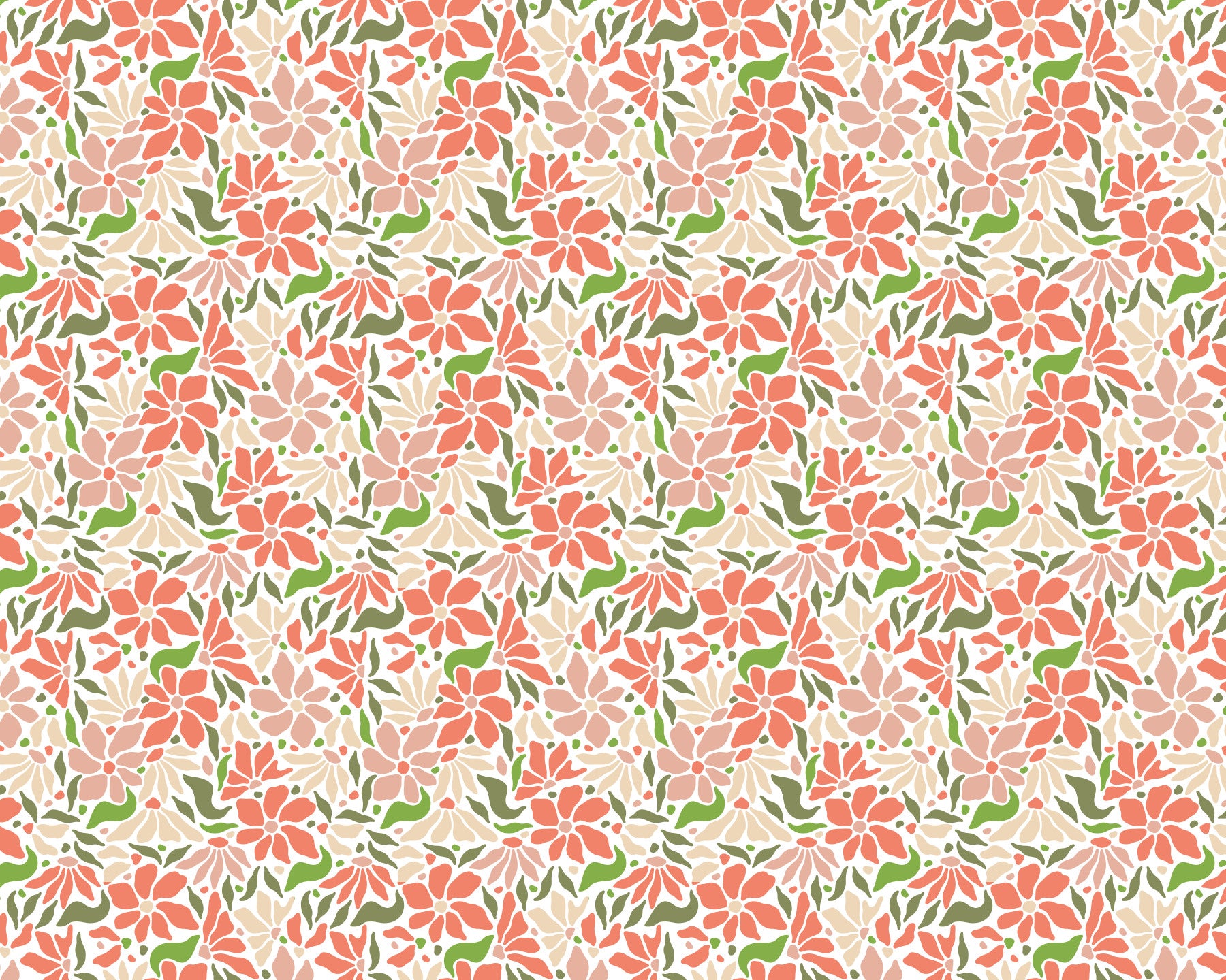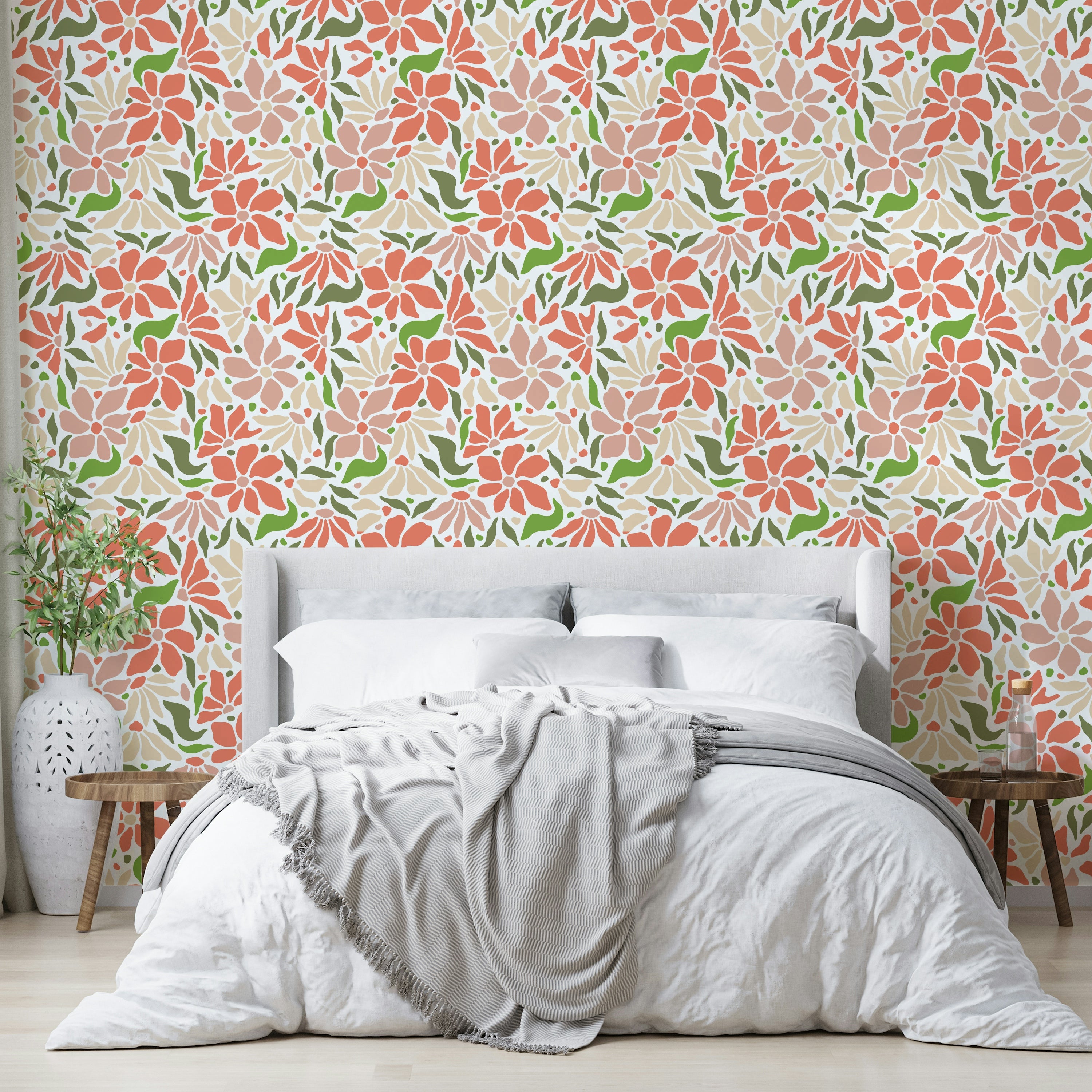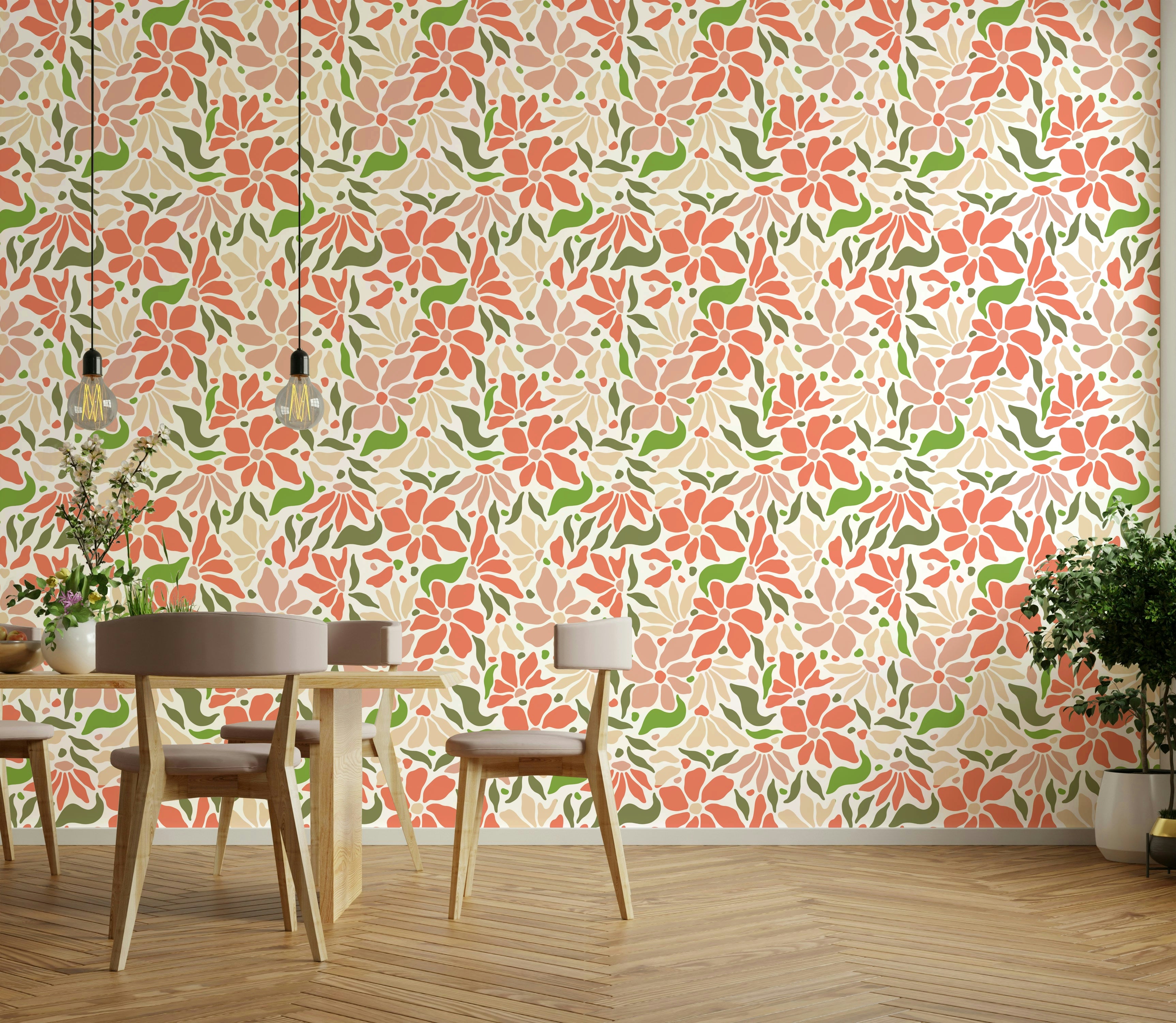 Dive into a vibrant world of retro floral charm with this 'Groovy Flowers Coral Green' wallpaper. A captivating array of stylized coral and peach blossoms dance across a crisp white background, interspersed with playful olive green leaves. The design evokes a sense of 70s-inspired optimism and carefree energy, making it a perfect choice for adding a touch of vintage flair to any space.