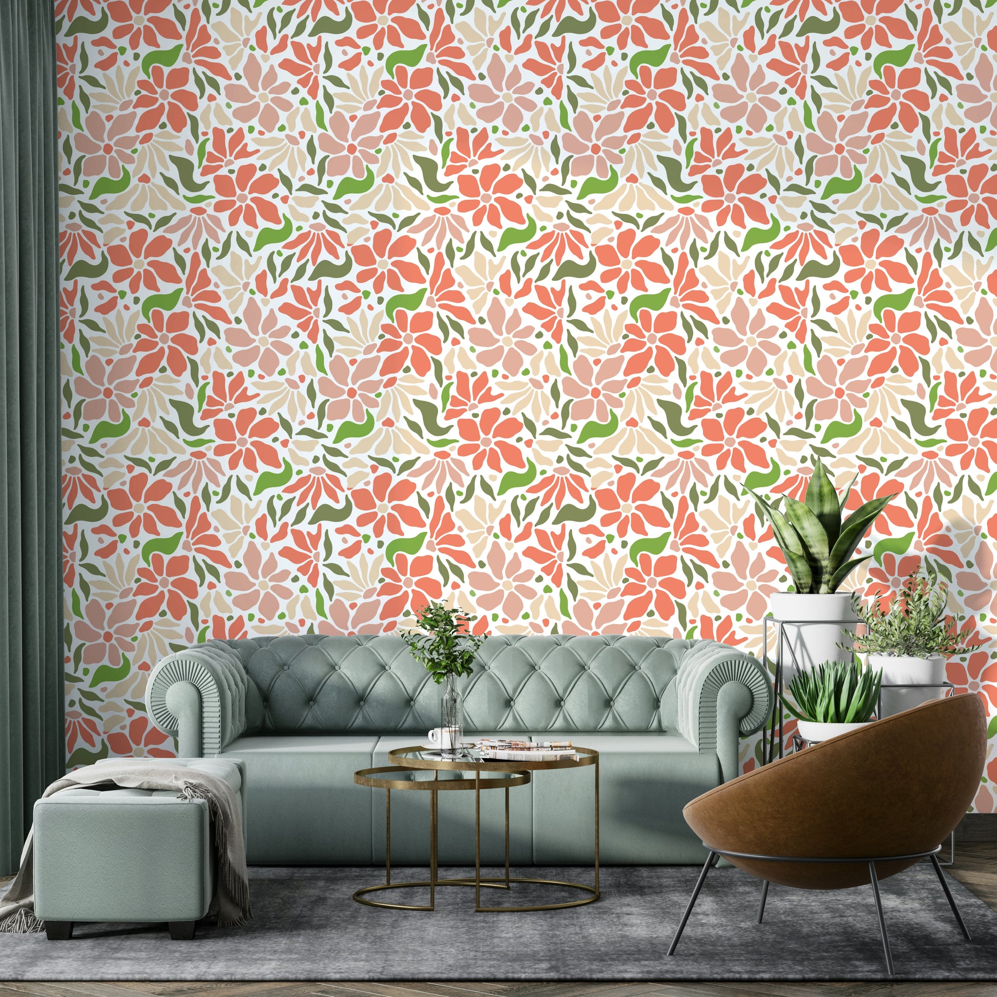 Groovy Flowers Coral Green Wall Mural