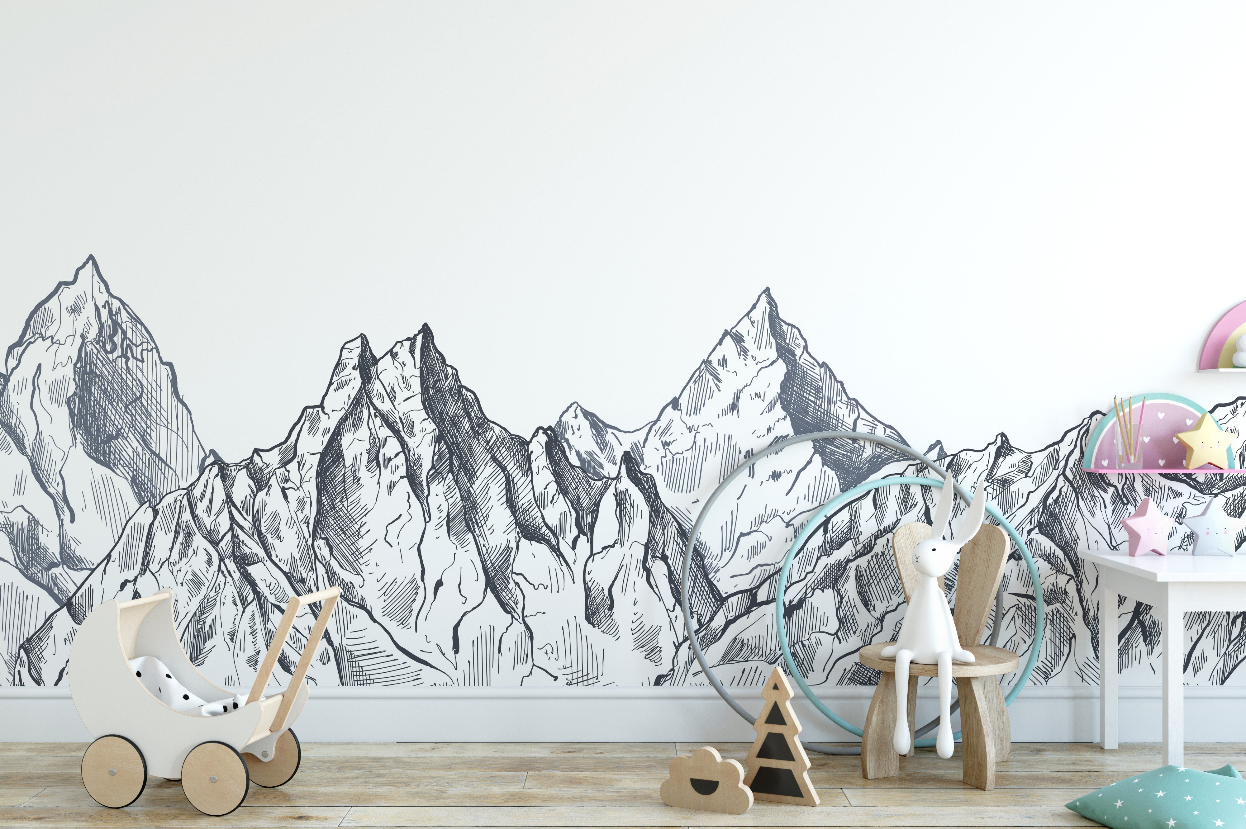 Whimsical hand-drawn mountain mural for serene wall decor.