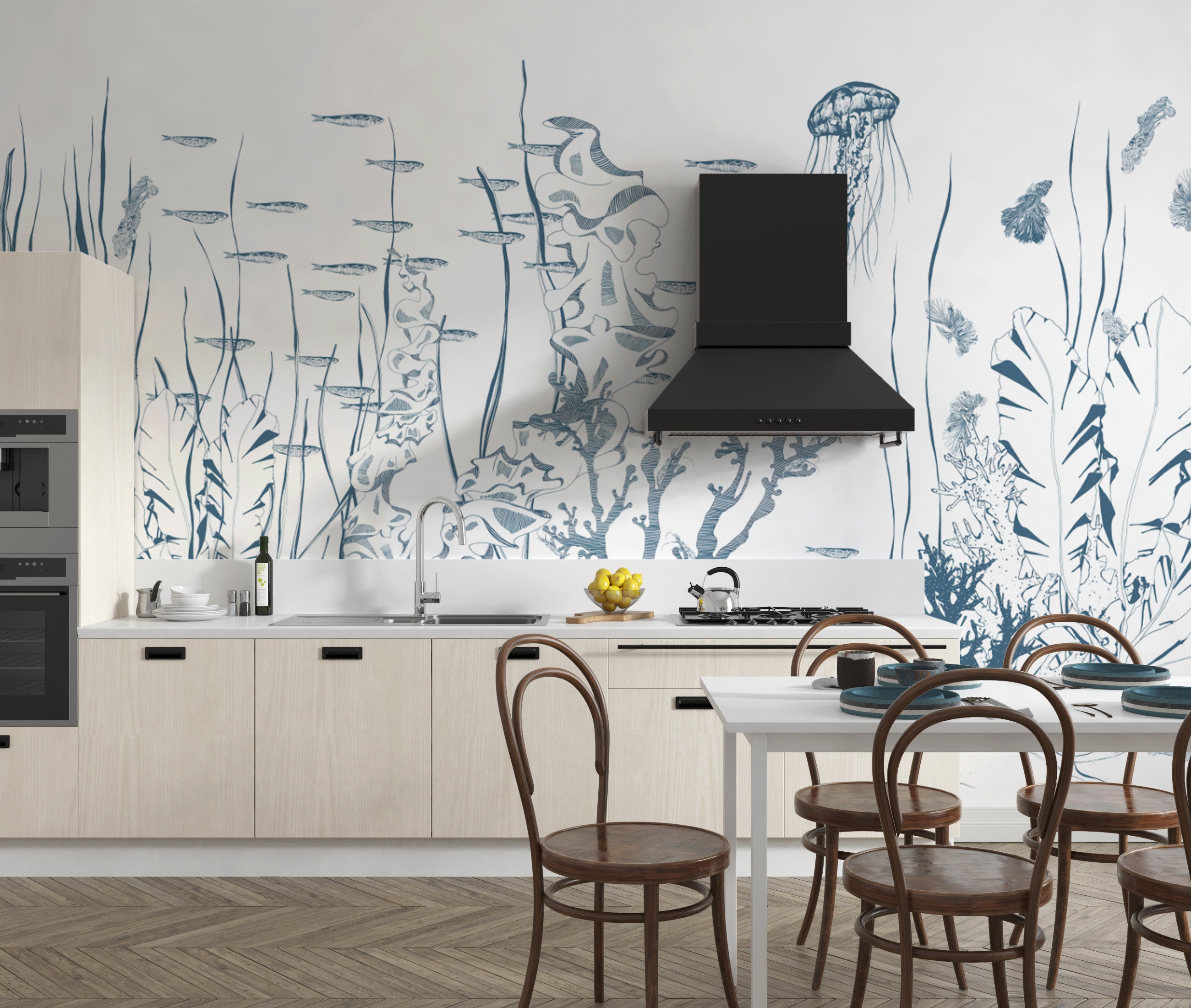 Transform your home into a stunning underwater paradise with the hand-drawn underwater marine mural. With detailed rendering of marine, seaweed, and coral reefs, this mural adds a coastal-inspired feel to your interiors. An ideal choice for marine enthusiasts, it features jellyfish, fish shoals, and aquatic plants, producing a calming marine atmosphere. This ocean-themed wall decor combines minimalist sophistication with nautical appeal, perfect for bedrooms, living spaces, and children's rooms. Printed on high-quality, durable materials, it ensures lasting beauty. Enhance your wall with this sea-life-themed wallpaper mural and discover the magic of the deep blue.