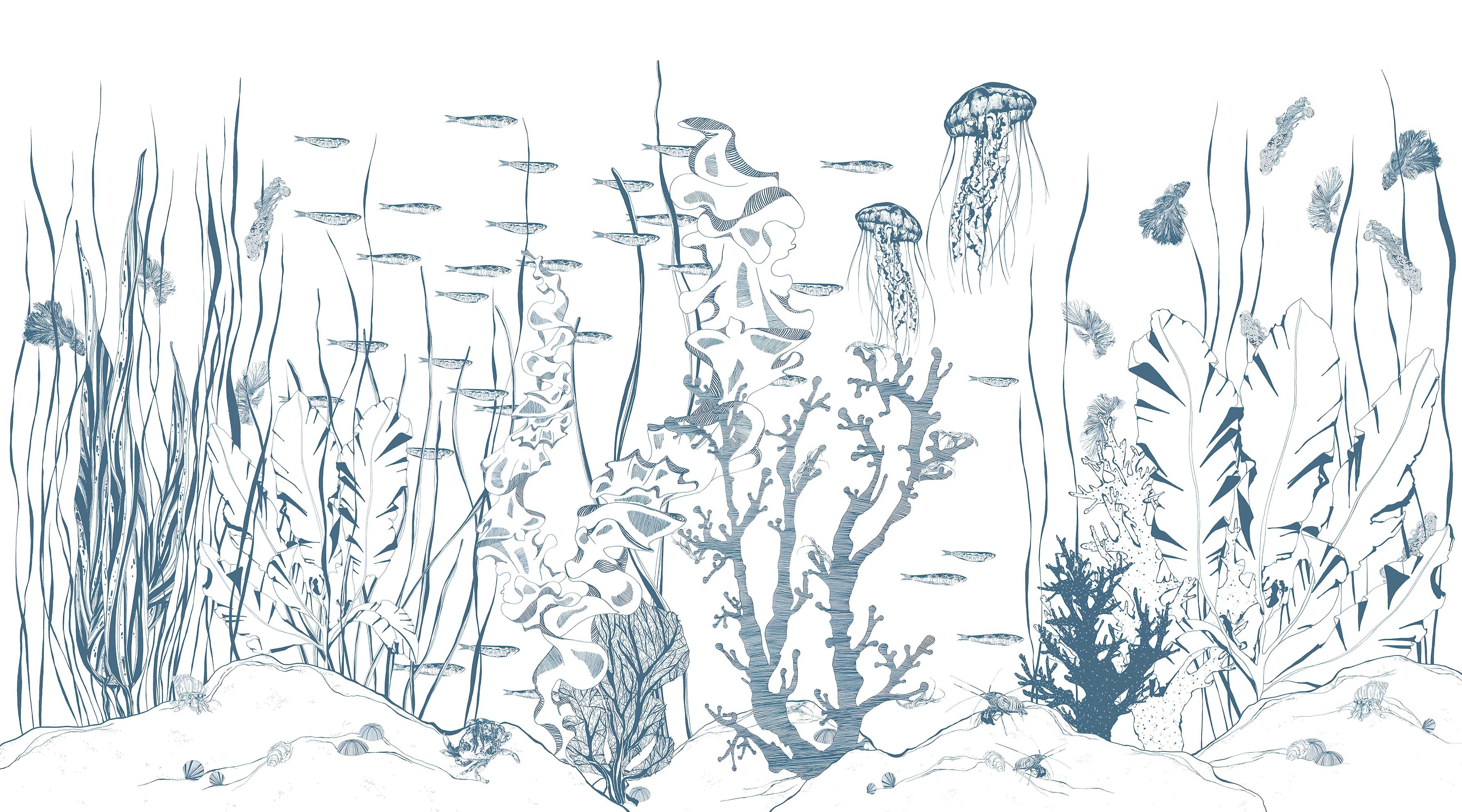 Detailed marine life sketch mural with aquatic plants