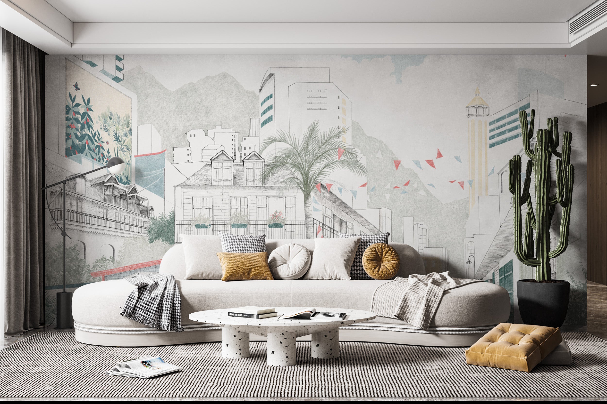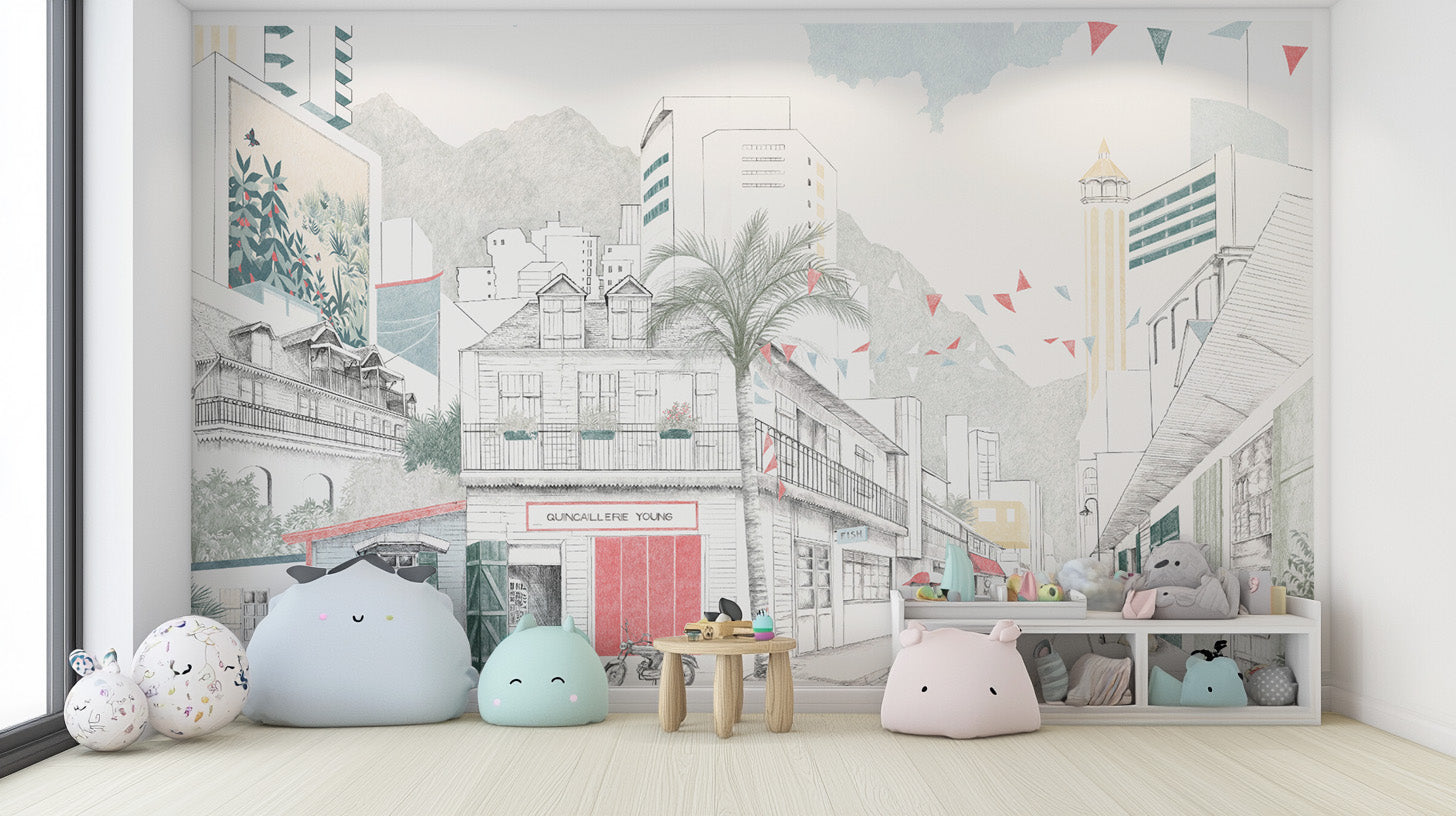 Give your space the charm of a hand-sketched cityscape wallpaper with this stunningly detailed urban sketch mural. Featuring a blend of vintage and modern architecture, this artistic urban landscape mural captures the essence of a lively city street with intricate buildings, lush palm trees, and festive bunting. Surrounded by the sketch-like city skyline, the image offers a sophisticated, clean aesthetic, a good fit for modern chic interiors. For a home, office, or café, this pastel cityscape mural takes your walls to the next level of stylishness. Elevate your décor with this architectural city mural, designed for timeless sophistication.