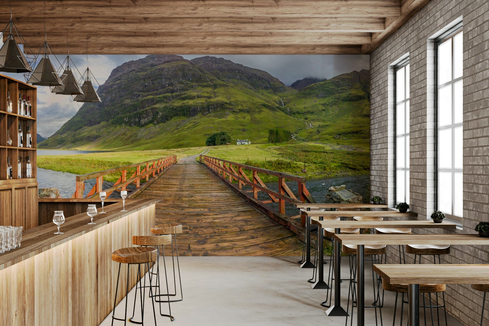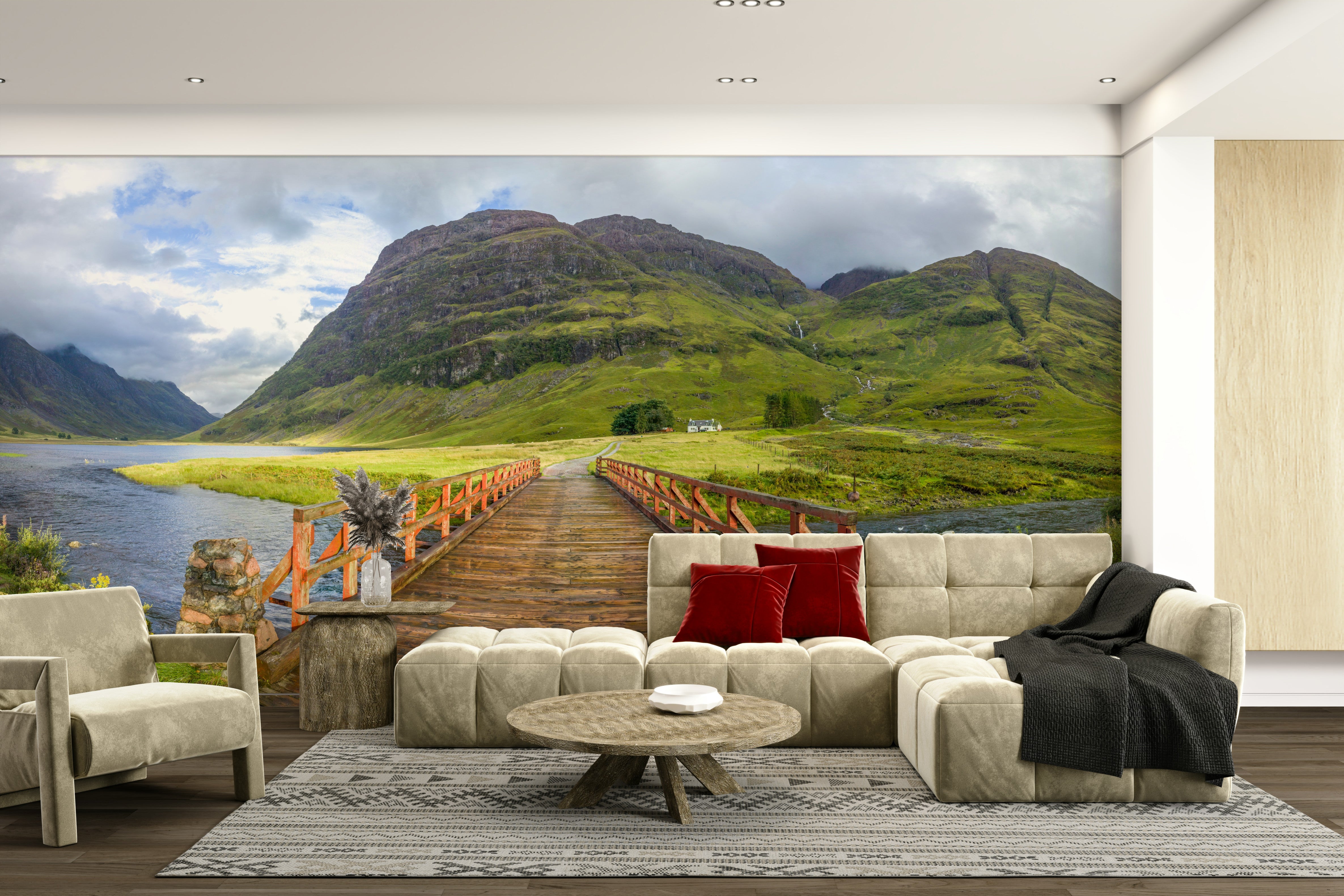 This breathtaking wallpaper captures the serene beauty of a rustic wooden bridge spanning a tranquil river, nestled amidst a stunning Scottish Highland landscape. Towering green mountains under a slightly cloudy sky create a dramatic backdrop, enhancing the peaceful atmosphere. The weathered wood of the bridge and the vibrant green hills evoke a sense of timeless tranquility and natural wonder. Perfect for those seeking a calming and inspiring escape to the beauty of nature.
