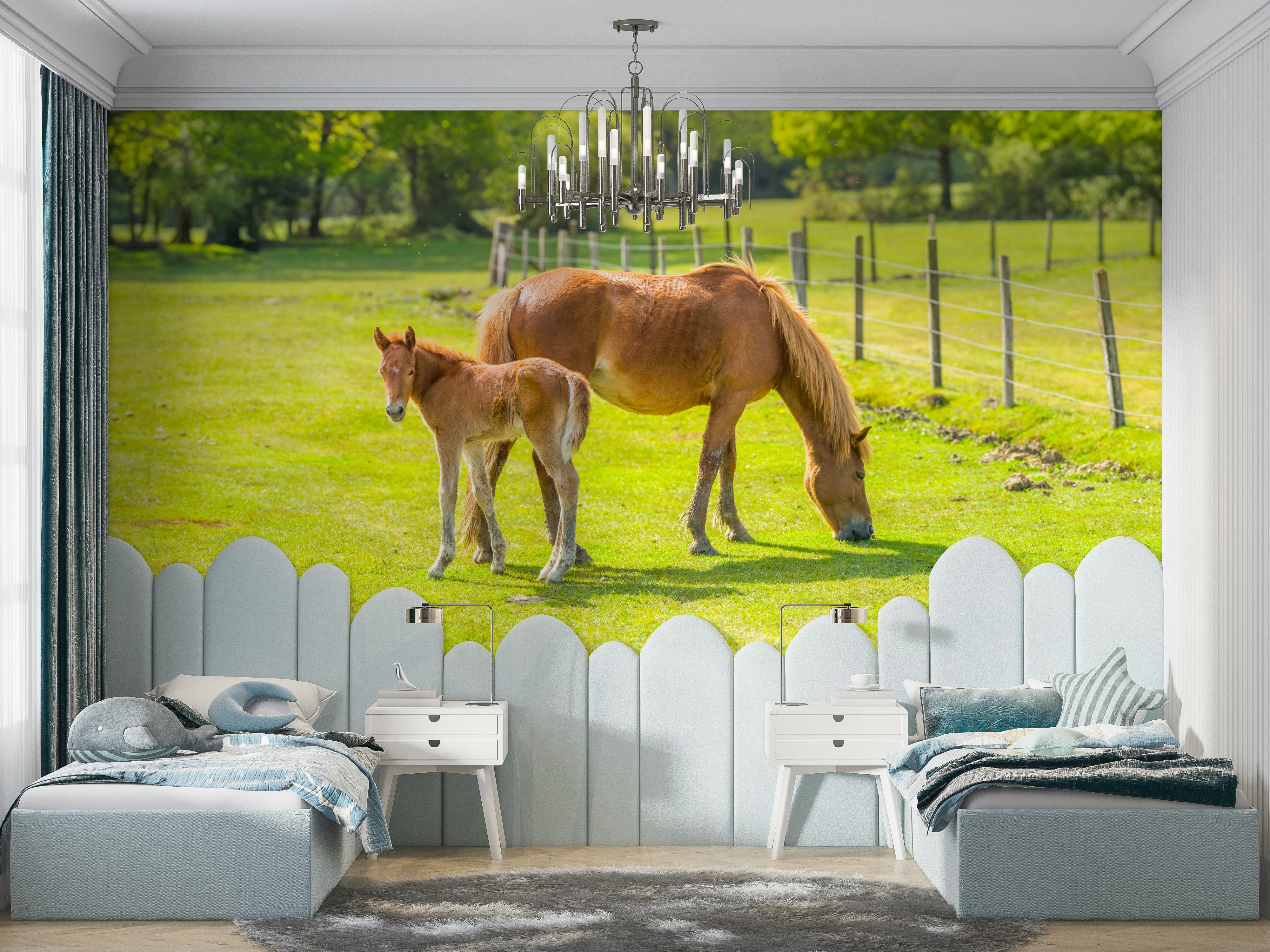 Bring the beauty of nature into your home with the Horse with Foal Wall Mural. Featuring a heartwarming scene of a mother horse and her foal grazing in a lush, green field, this mural creates a calming atmosphere perfect for any room. The serene rural landscape adds a touch of tranquility, making it ideal for living rooms, bedrooms, or nurseries. With its gentle and natural charm, this mural captures the bond between a mother and her young foal, bringing a peaceful and nurturing vibe into your home. Perfect for those who appreciate animals and the beauty of the countryside.
