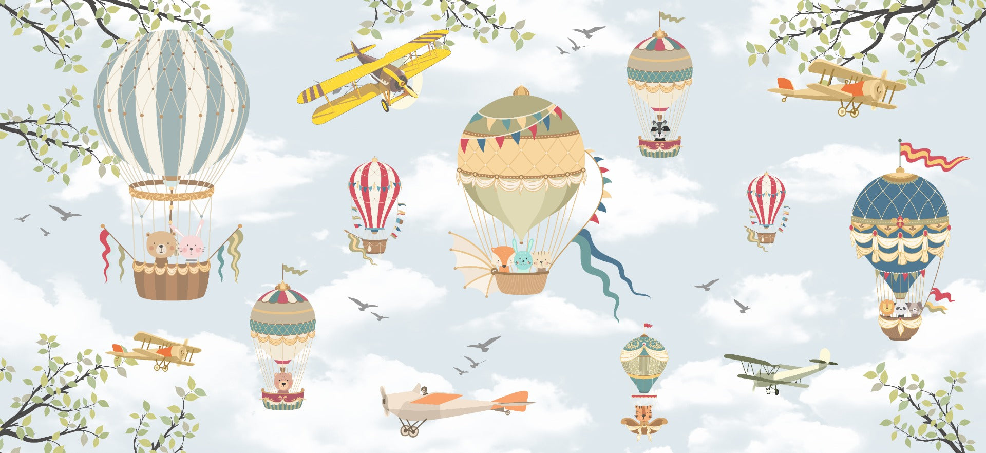 Delight your child's imagination with our captivating hot air balloon wallpaper mural for kids room. Featuring playful hot air balloons, bunnies, and bears, this design promises an adventurous atmosphere in any room. The inclusion of gliders in the sky brings an extra layer of excitement, making it a lively addition to a child's bedroom or a baby's nursery.