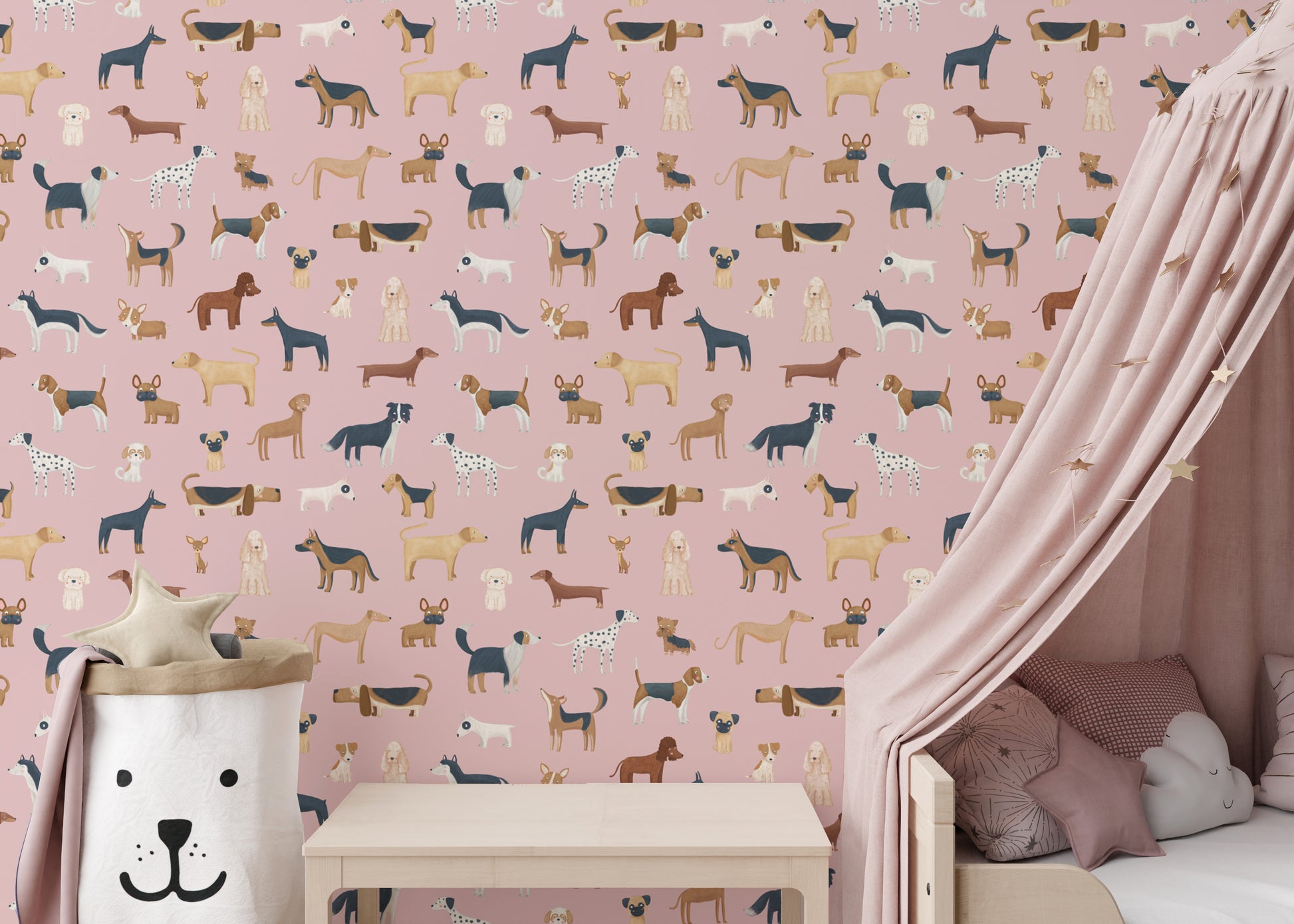 Embrace a splash of playfulness with the Hounds in Hues pink dog wallpaper, where charm meets chic in a delightful dance of dog motifs. This dog-themed wallpaper features a mix of breeds on a warm pink backdrop, creating a cute dog print perfect for any space. Whether you're styling a nursery, a wallpaper for kids room, or adding whimsy to a hallway, this animal print wallpaper delivers both personality and style. Designed as a peel and stick wallpaper, it’s easy to apply and remove. Choose this playful pink dog wallpaper for kids room or pet-friendly interiors to brighten your walls.