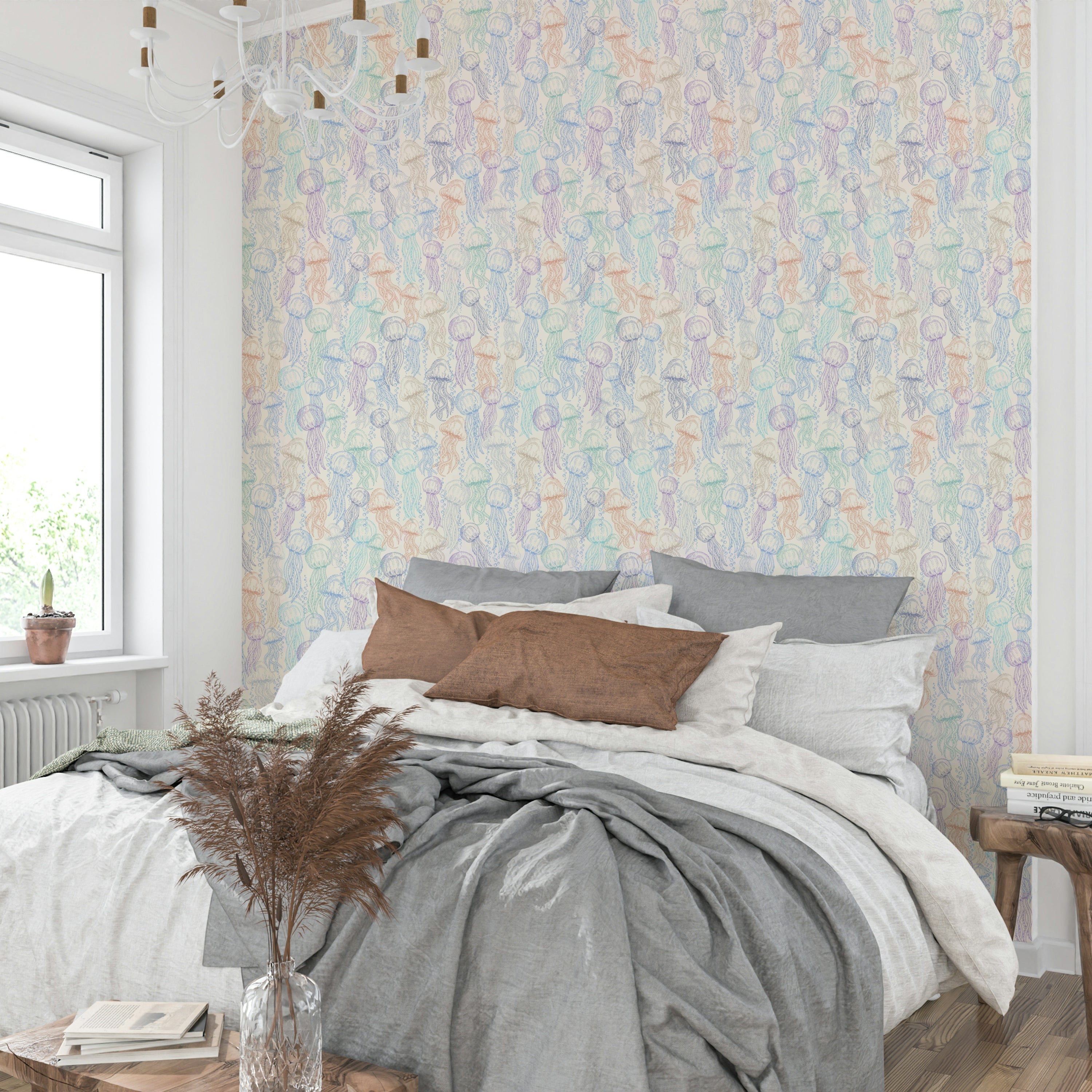 Dive into a whimsical underwater world with this 'Jellyfish Doodles' wallpaper. A captivating pattern of delicately sketched jellyfish floats across a soft, creamy background. Rendered in a charming pastel palette of blues, purples, and oranges, each jellyfish is uniquely detailed, showcasing its graceful tentacles and bell-like body. The addition of playful bubbles adds a sense of movement and lightheartedness, making this a perfect choice for those seeking a serene yet playful aesthetic. The intricate doodle style brings a hand-drawn charm, evoking a feeling of calm and quiet beauty. Transform your digital space into an enchanting ocean dreamscape.