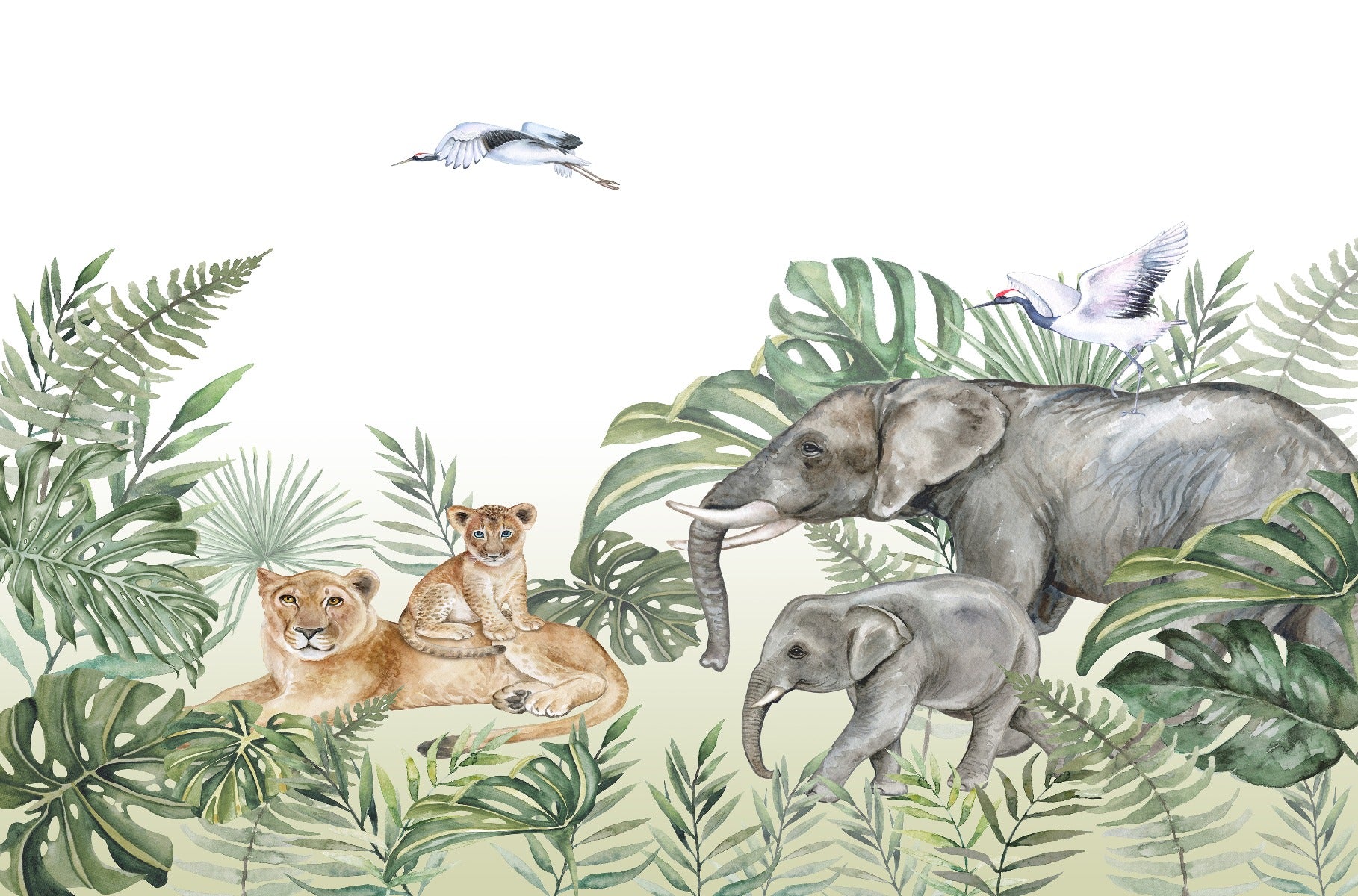 Step into the realm of the majestic with our Royal Jungle Safari Wallpaper Murals. Designed for those who appreciate an element of the wild in their domestic oasis, this peel-and-stick African safari wallpaper mural captures the essence of a thrilling jungle safari. It boasts a lighter background that cleverly gives the illusion of a more spacious room while still teeming with royal wildlife, creating a dynamic and authentic experience.