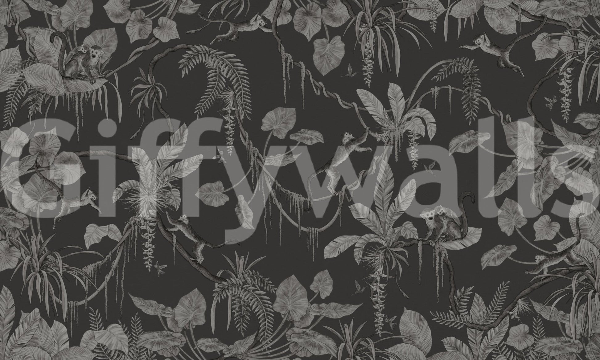 Transform your space with this captivating jungle scene. Monkeys swing through the lush foliage, bringing an element of playful sophistication. The grayscale palette provides a contemporary twist on a classic design, perfect for a living room, bedroom, or dining room. This stylish wallpaper for walls adds depth and character to any room. The intricate details and monochromatic design creates a dramatic effect while complements interiors with a touch of wild elegance.