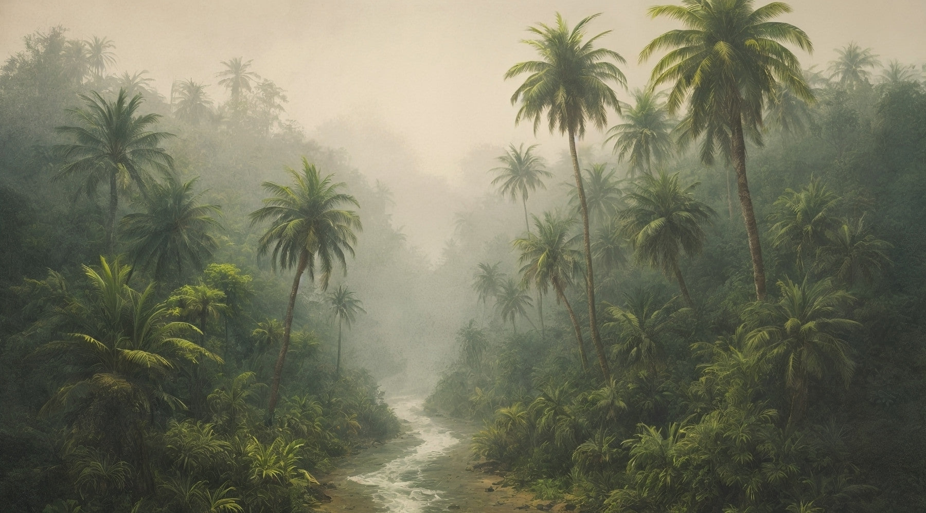 Bring the soothing embrace of nature indoors with this captivating wallpaper for walls. A tranquil river winds through a dense jungle of lush palms, shrouded in a gentle mist. The soft green palette creates a relaxing ambiance, perfectly suited for bedrooms, living rooms, or even a home office. This design enhances interiors with its calming presence, offering a serene escape from the everyday hustle and bustle and a sense of peace.