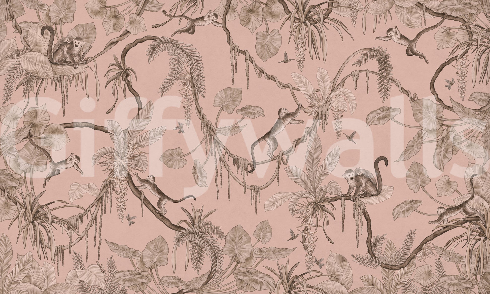 Invite a touch of the exotic into your home with this captivating jungle-themed wallpaper. Monkeys frolic amongst lush tropical flora in a warm, inviting beige and brown palette. The detailed, illustrative style brings a sense of playful sophistication to any room. Use this wallpaper for walls to create a feature wall in a living room, bedroom, or even a nursery. It complements interiors with natural wood tones and soft lighting, fostering a relaxed atmosphere.