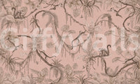 Jungle wallpaper depicting birds singing and monkeys playing among trees