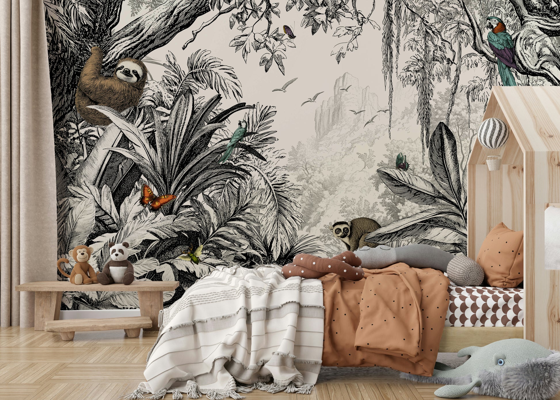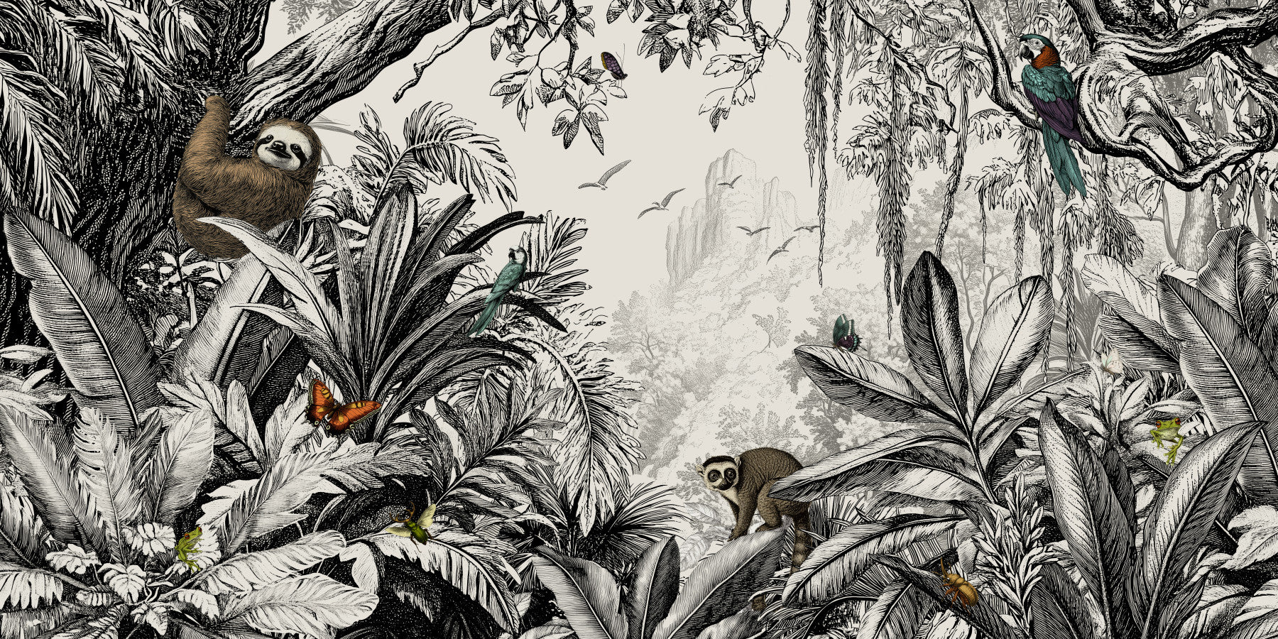 Immerse yourself in a dense tropical jungle atmosphere, teeming with wild animals and beautiful butterflies. Drawn in an antique natural history style, this black and off-white, junglecore mural illustration features an adorable sloth, cheeky lemur, bright macaw parrot and even more creatures, rendered in full color, nestled in the lush foliage. Your room will take on a magical, richly historic feeling with this beautiful Jungle Vista mural.