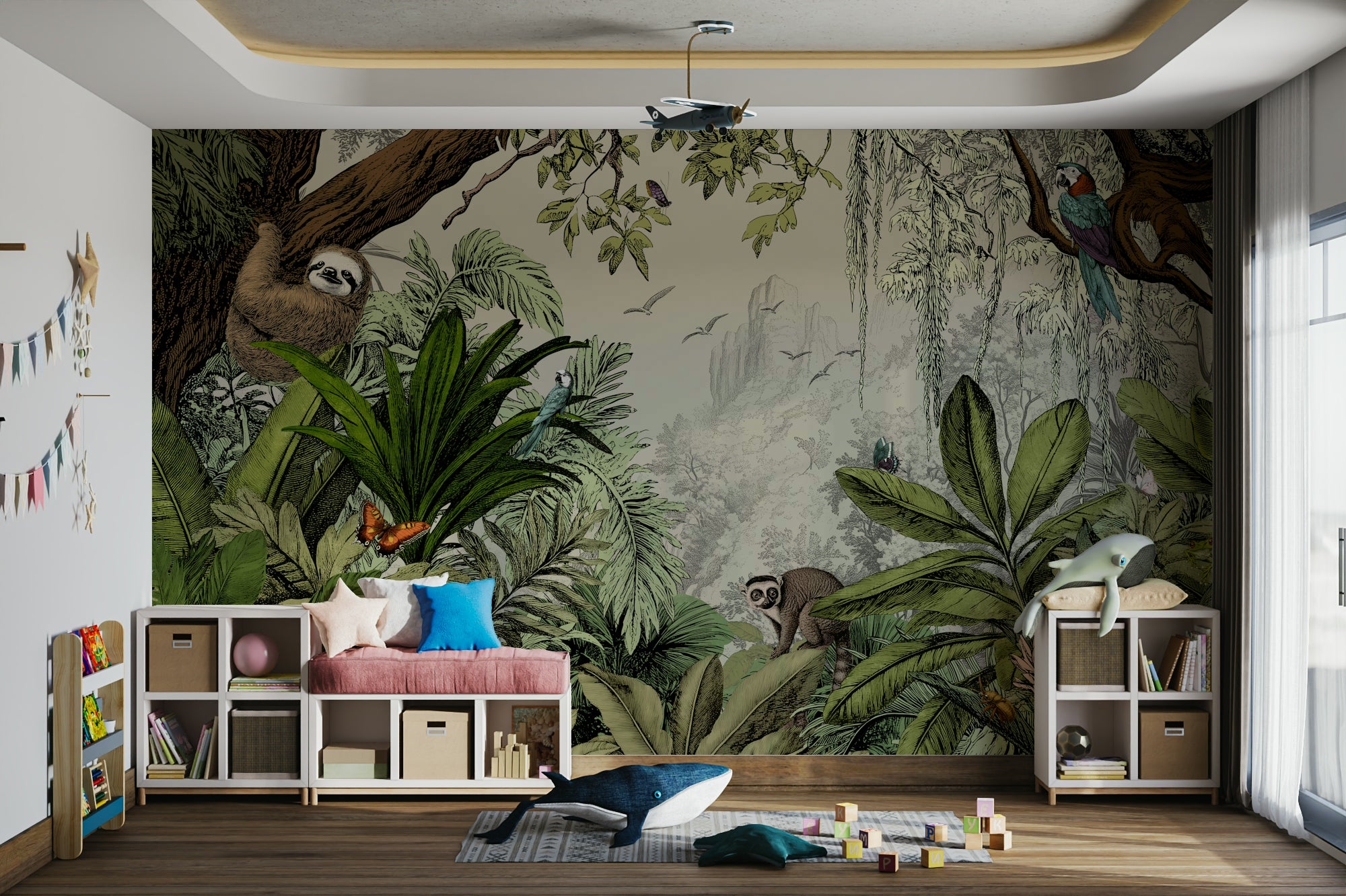 Bright and lively jungle mural wallpaper for nature-loving decor.