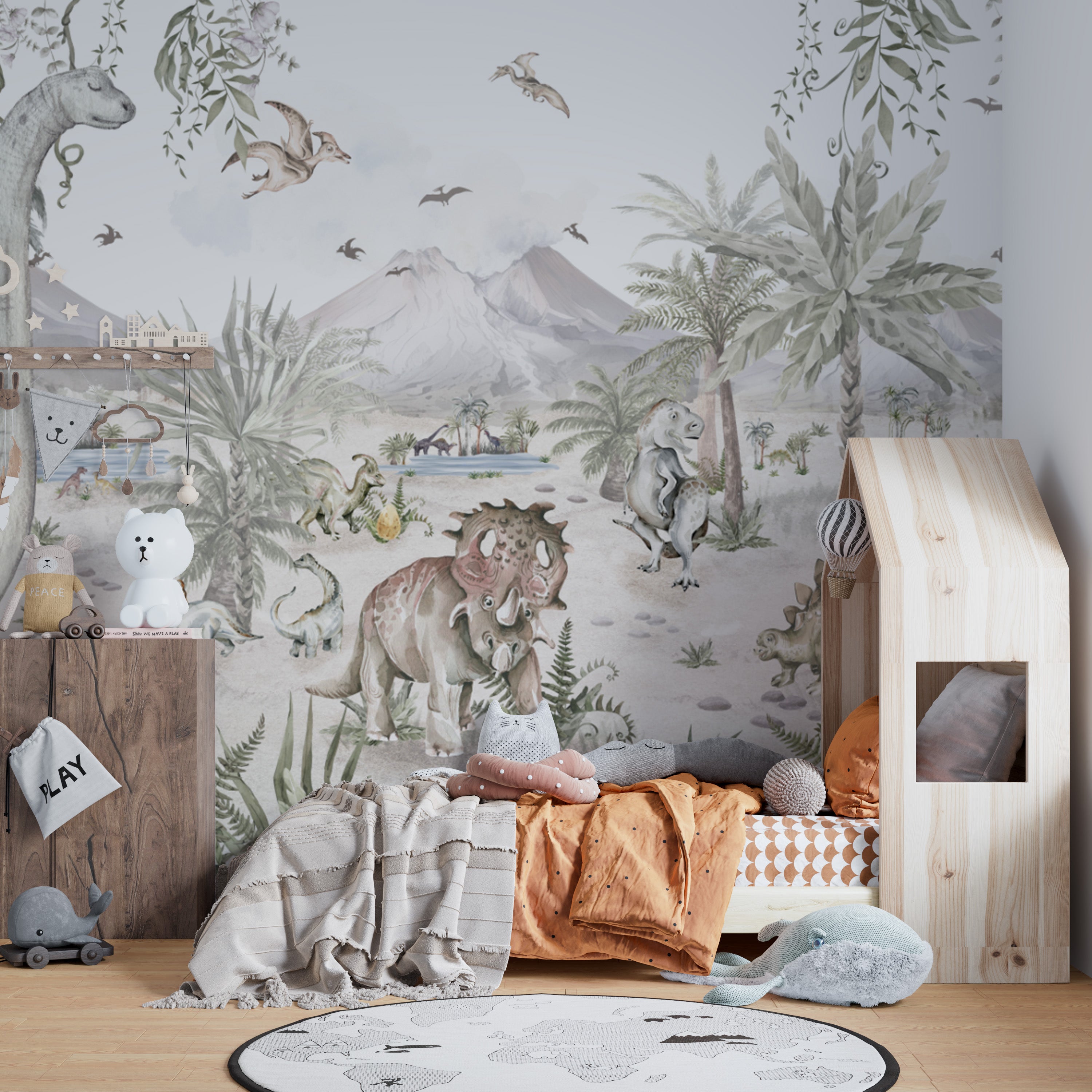The Jurassic dinosaur landscape wallpaper brings a prehistoric world to life with detailed watercolor dinosaurs roaming a lush jungle. Towering Brachiosaurus, fierce Tyrannosaurus, and gentle Triceratops wander through a land of volcanic mountains and tropical plants. Flying reptiles soar above, adding excitement to this dinosaur wallpaper for kids. The muted earthy tones and intricate details create a visually engaging dinosaur landscape mural perfect for young explorers. This Jurassic-era wallpaper mural turns walls into a scene filled with adventure and history, making it ideal for a playroom or bedroom. The realistic design captures the essence of a prehistoric jungle.