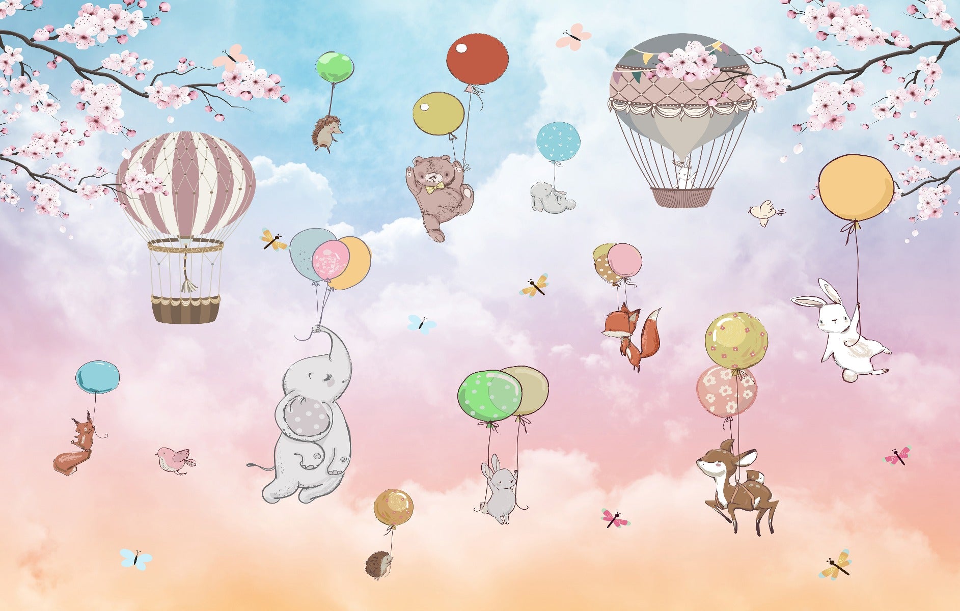 Animals in hot air balloons wall mural design