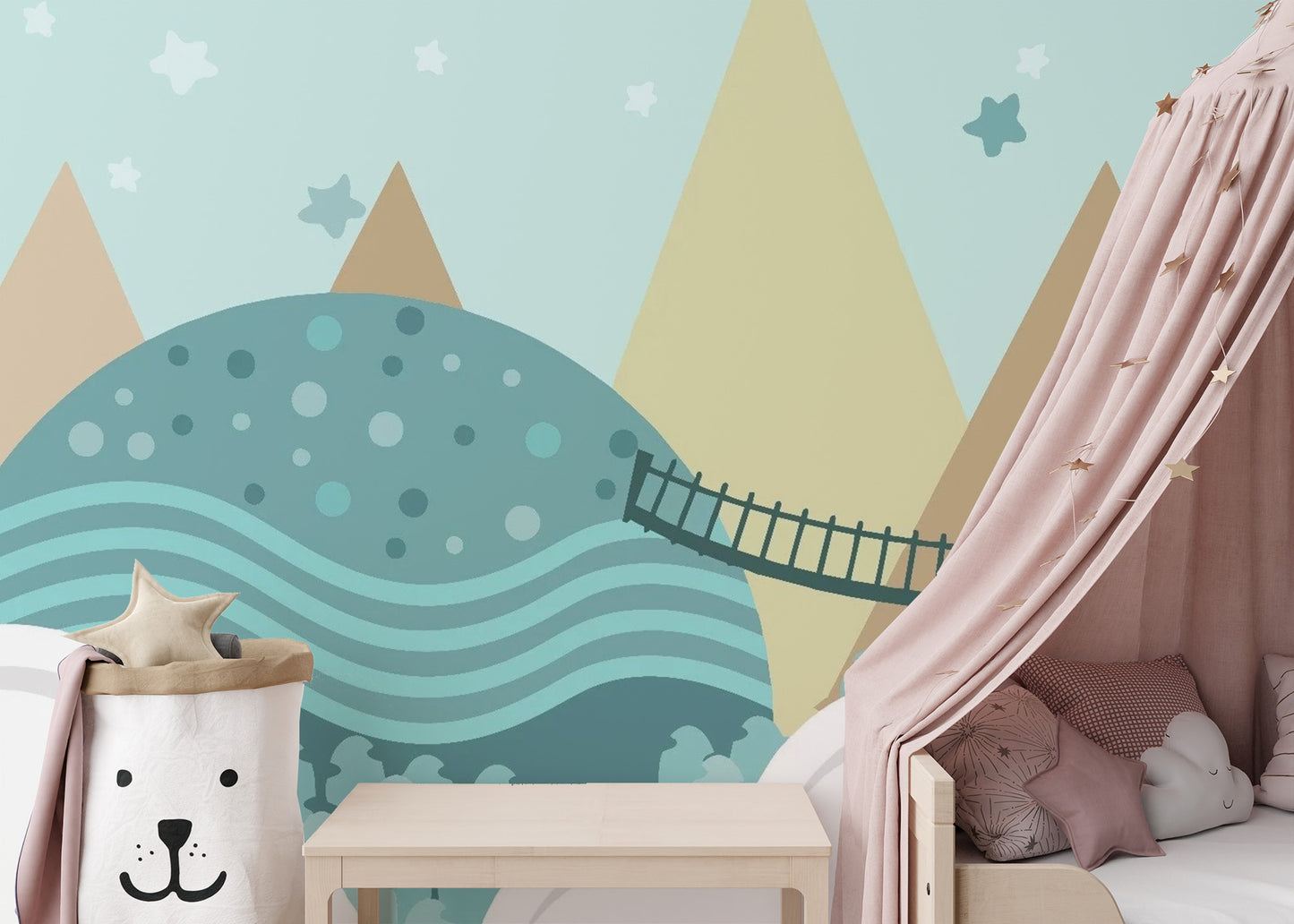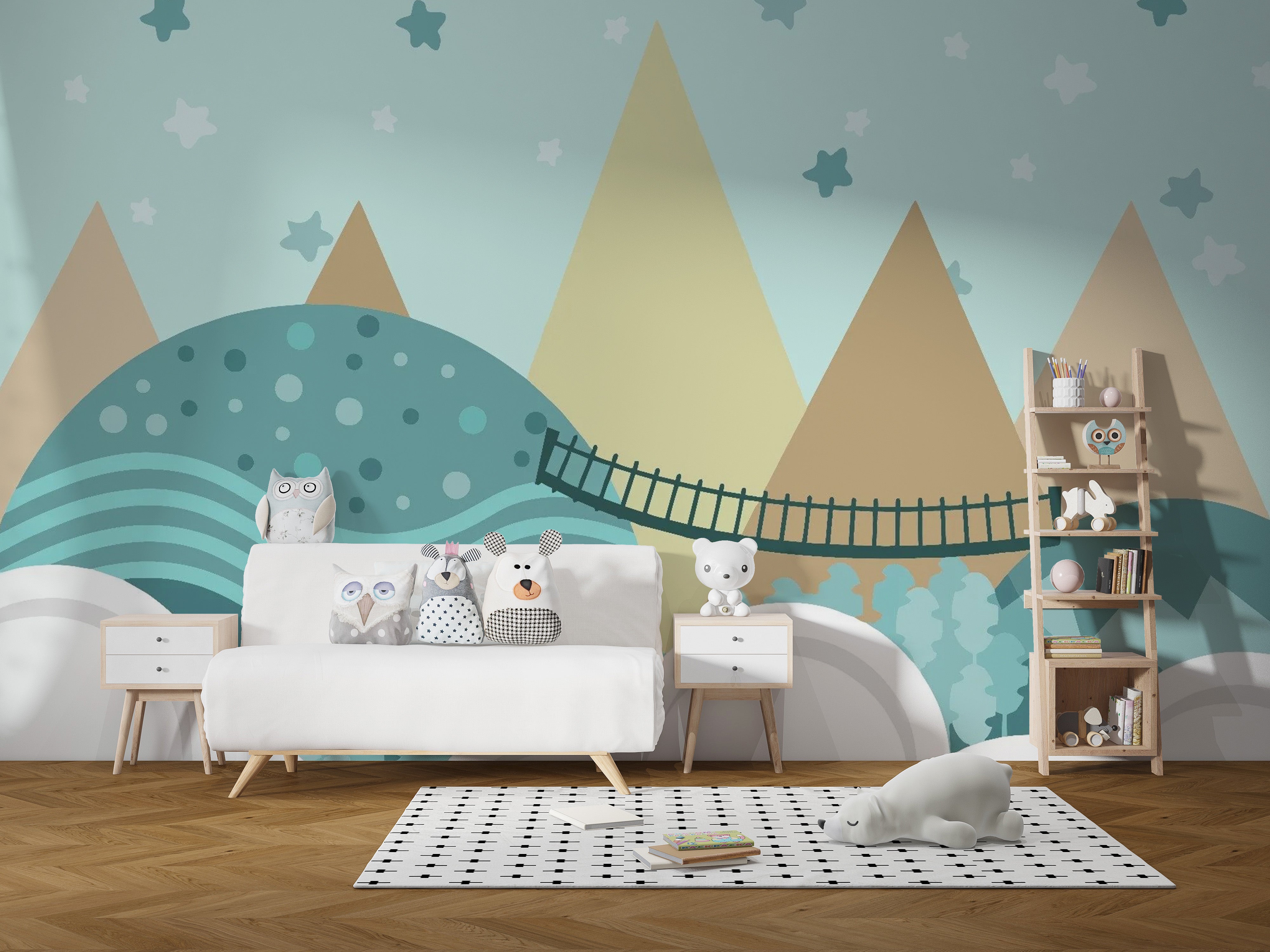 Brighten your child's room with our enchanting Kids Animated Pastel Mountain Wallpaper! Immerse their space in a fairytale fantasy, complete with cartoon mountains, whimsical bridges, twinkling stars, and friendly trees. Each vibrant motif bursts with color, bringing energy and a playful spirit to any nursery or bedroom.