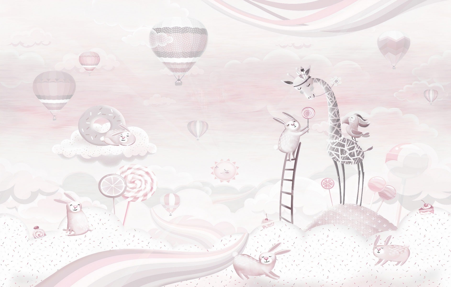 Brighten your home with the Pink Color Candy World Wallpaper Murals, an enchanting addition to any room. These self-adhesive, peel-and-stick murals are a breeze to apply, transforming your space into a whimsical candy land. The design features a delightful blend of white and pastel pink hues, creating a serene and romantic atmosphere. Adorned with playful bunnies, fluffy clouds shaped like donuts, and a friendly giraffe, these murals are perfect for adding a touch of magic and joy.