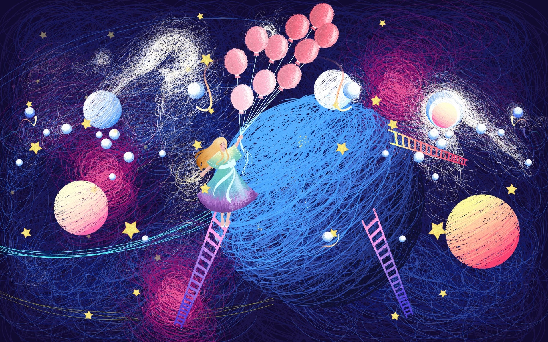 Girl on the Planet with Flying Balloons Wallpaper