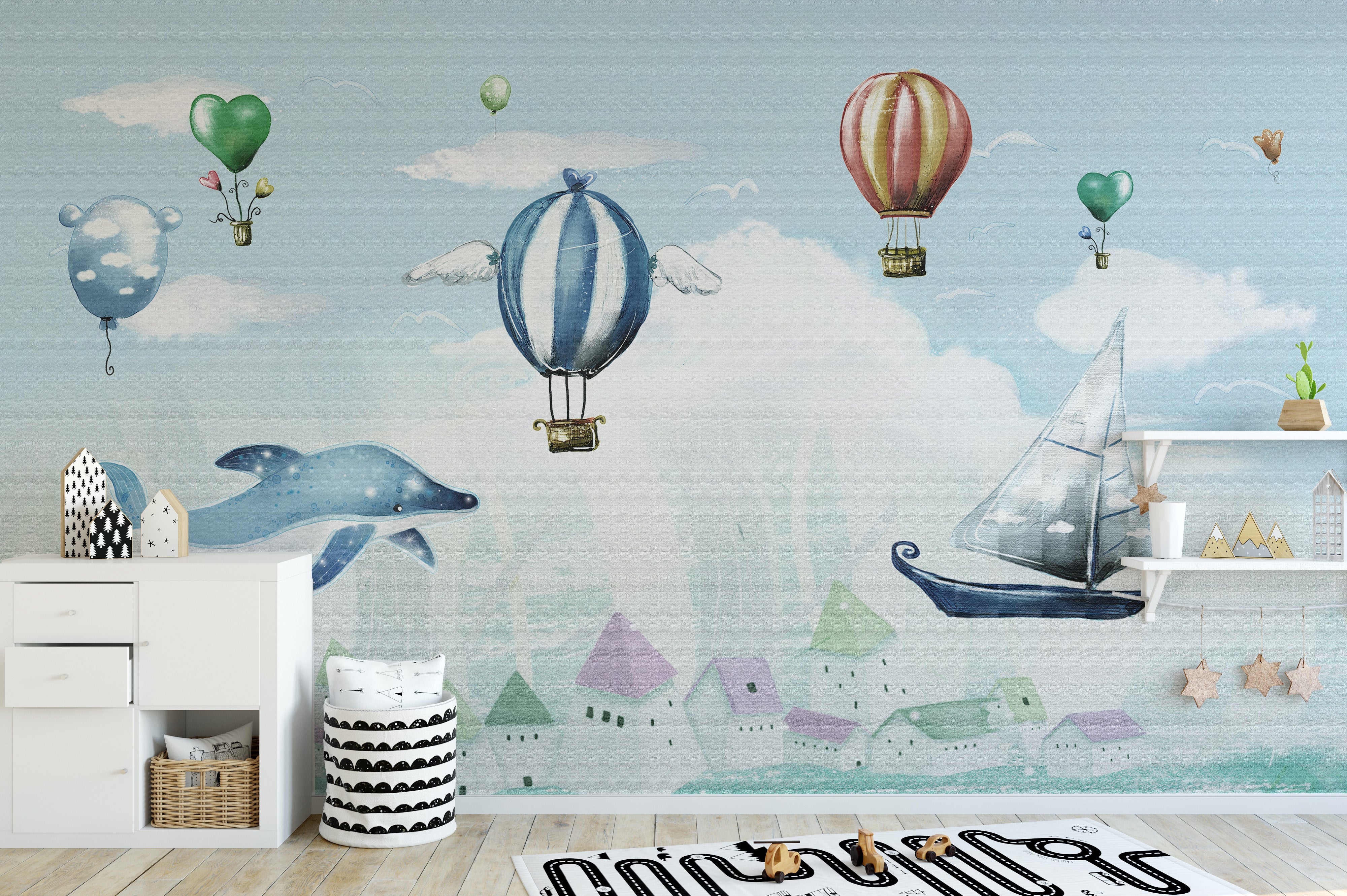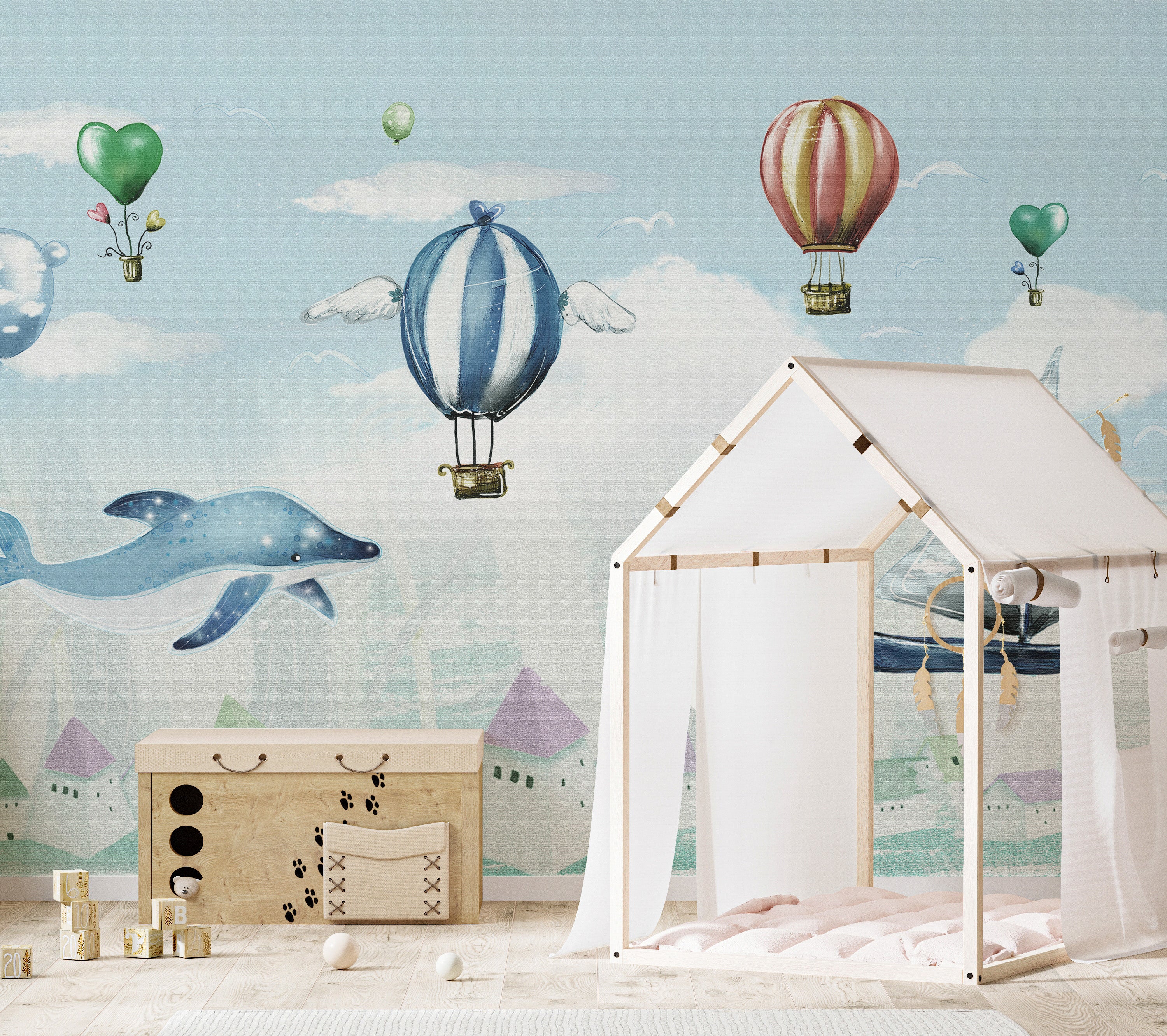 If you are searching for an ultimate creative new design for your kid's bedroom walls, our cartoon 'Flying hot air Balloons' wallpaper mural is a perfect choice for a baby’s nursery and kid's room. This exclusive design features vibrant colored striped hot air balloons floating through a blue sky along with the fluffy cotton white clouds and a cute dolphin sailing on an adventure with a yacht. Order this stylish design from us now, to transform your child’s bedroom into a delightful place. This mural design is best suited for kid’s rooms, hallways, and nurseries. Choose your favorite mural from our wide range of best designs.