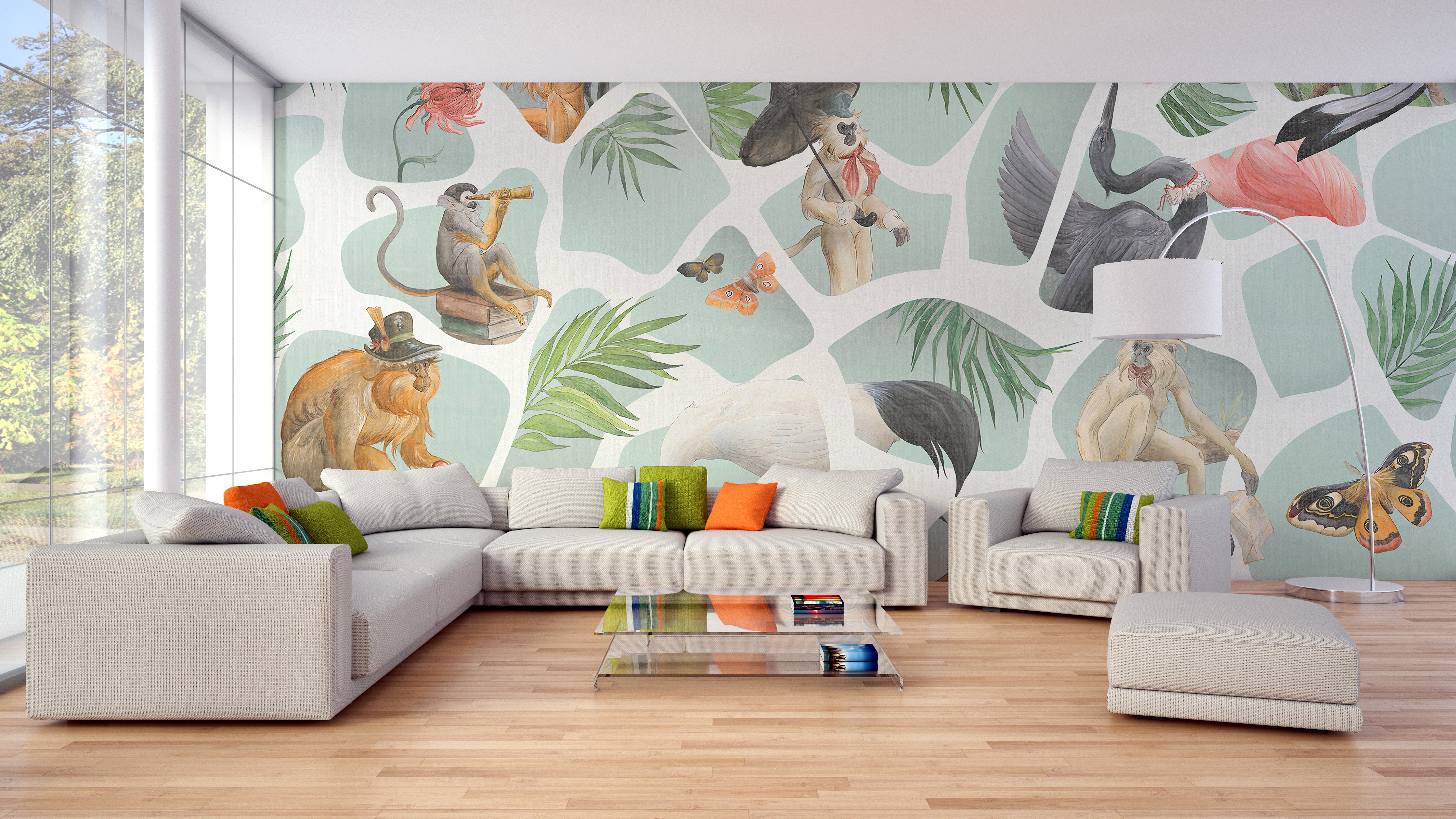 Bring nature indoors with our watercolor monkey wallpaper and bird mural. A perfect blend of wildlife and art, these beautiful murals have been designed with the sweet appearance of cute monkeys and colorful birds in an emerald green, lush, tropical setting. Suitable for living rooms, kids' rooms, or home offices, this nature-themed wallpaper will surely add a unique charm to any space. Hand-painted soft watercolor gives the murals a calm, artistic look that brings excellent value to your walls. They are orderable in any size to fit perfectly into your room, along with the benefit of our high-quality, eco-friendly materials, which make it easy to set them up. This unique watercolor jungle wallpaper will change the skin of your space and fill it with the grandeur of nature.
