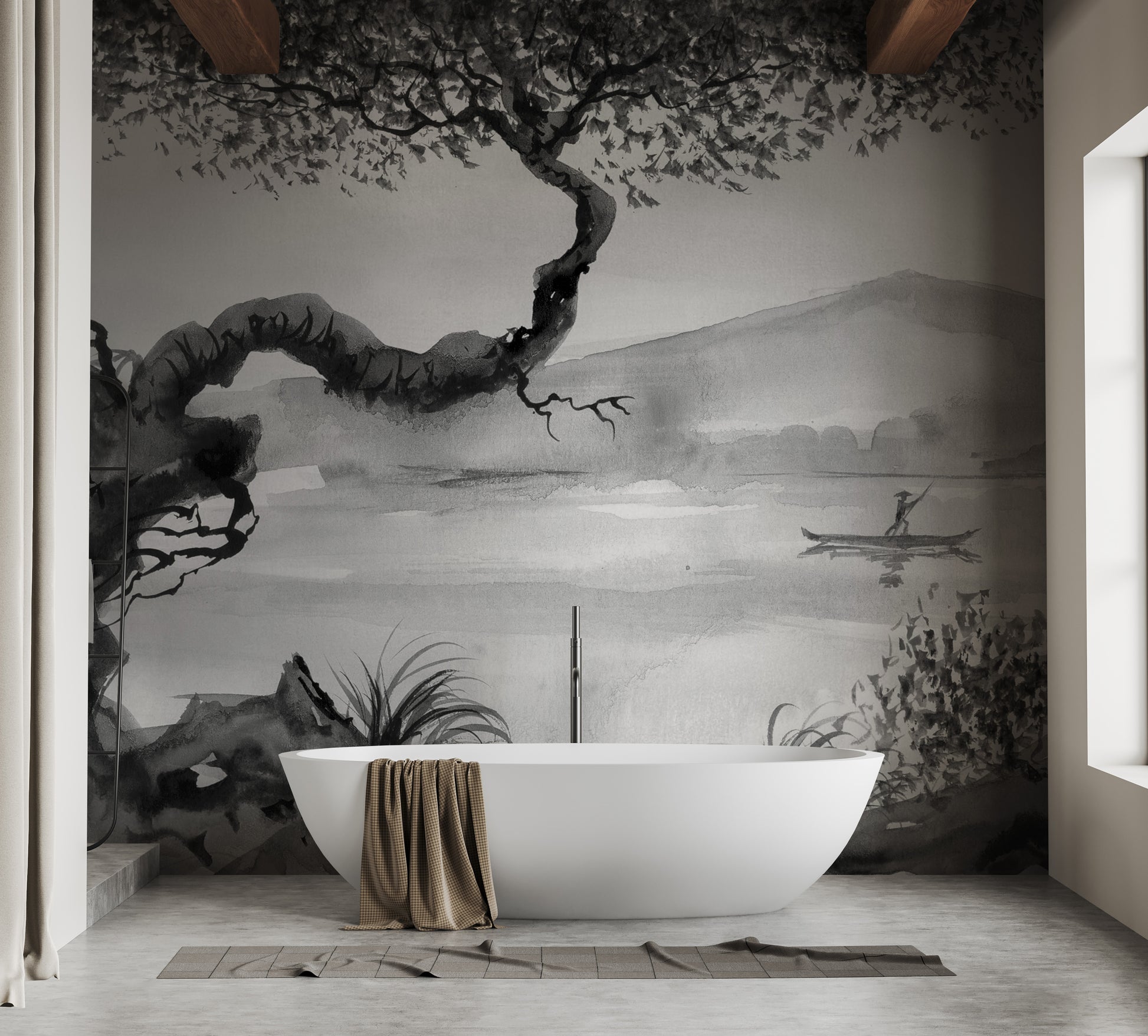 Transform your living space into a tranquil sanctuary with our watercolor brushstroke lakeside view wallpaper murals. Bask in the serenity of a gentle lake embraced by the subtle majesty of distant mountains, all captured through the delicate artistry of ink and watercolor. This mural, 'The View', is an ode to simplicity and elegance, featuring a palette of deep grey and off-white hues that will infuse your room with a peaceful, minimalist charm.