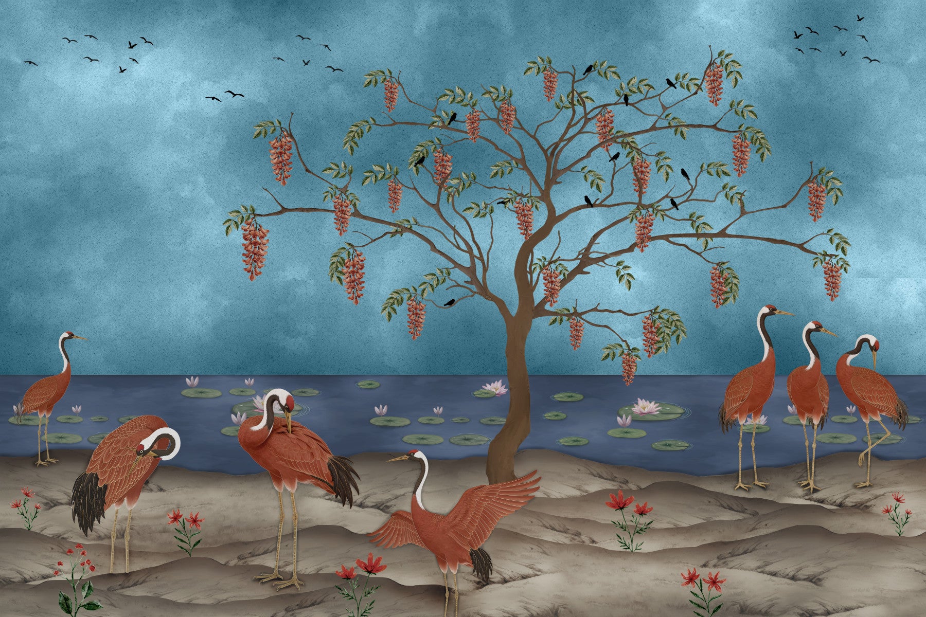 Transform your living space with this captivating wallpaper for walls, depicting an elegant Eastern landscape. Graceful crimson cranes gather by a tranquil lake adorned with delicate lotus blossoms, set against a textured blue sky. A majestic tree, heavy with cascading reddish-orange blooms and small perching birds, anchors the scene amidst a subtle, undulating brown landscape. This design’s harmonious palette of serene blues, earthy browns, and rich terracotta brings a sense of calm and sophistication to any room. Ideal for creating a feature wall in a dining room, living room, or bedroom, it also adds an exotic touch to a peaceful home office or an inviting hallway. The intricate details and balanced composition enrich interiors with a timeless, artistic presence.