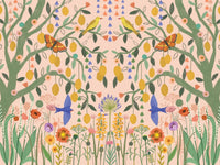 A vibrant and whimsical wallpaper design featuring stylized lemon trees laden with golden fruit. Butterflies and birds flit amongst the branches, adding a touch of playful movement to the idyllic scene. Delicate flowers and decorative elements in a soft color palette create a sense of tranquility and natural beauty. The symmetrical composition and artistic rendering evoke a feeling of serene harmony, perfect for adding a touch of bohemian charm to any space. This wallpaper is a celebration of nature's vibrant colors and delicate details, offering a refreshing and uplifting visual experience.