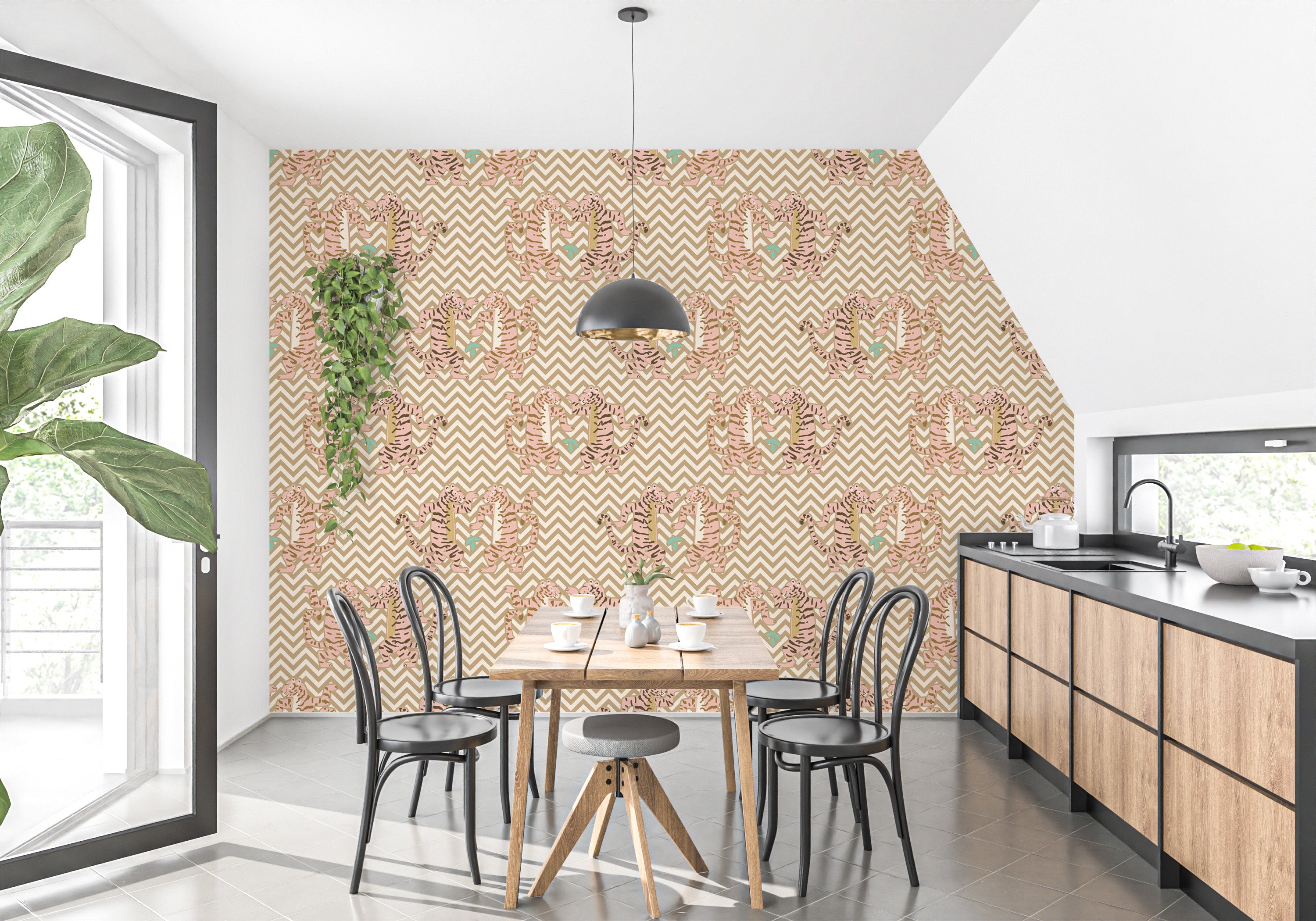 Stylish light sand wallpaper with tiger and zigzag motifs