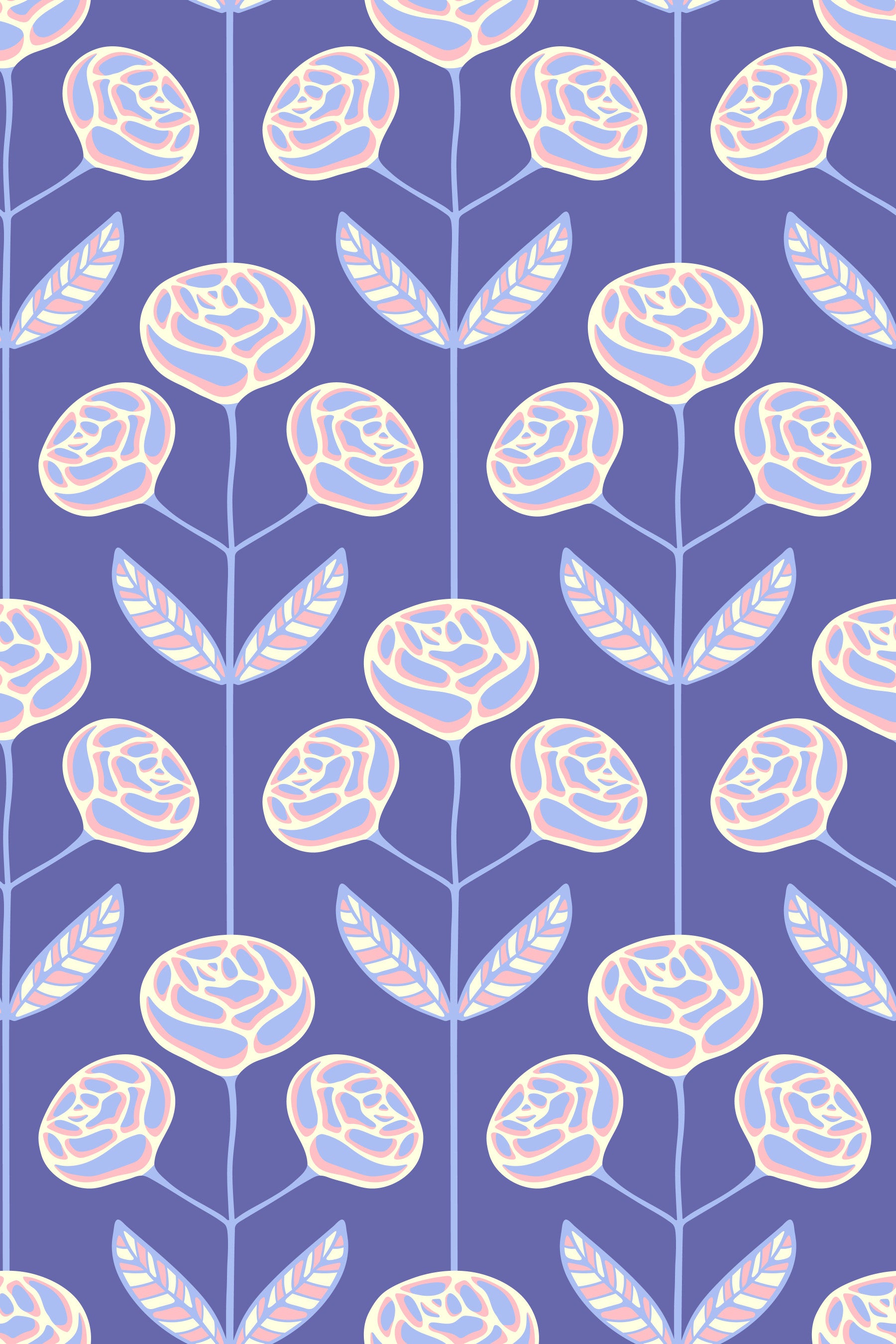 Step back in time with this Lola rose floral, a retro-inspired wallpaper that blends Scandi simplicity and Mid-Century Modern charm. This delightful design features stylized rose flower motifs in a fresh palette of lavender, pink and cream set against a Very Peri Purple background. The clean lines and symmetry evoke a classic mid-century aesthetic, while the charming flowers add a touch of cottage-inspired whimsy. Whether you're looking to add a pop of color to a minimalist space or enhance a vintage-themed cottage decor, this wallpaper offers a versatile and pretty solution. This pattern design is also available in Other Colourways too! Original wallpaper pattern design by Jackie Tahara of UnBlink Studio.