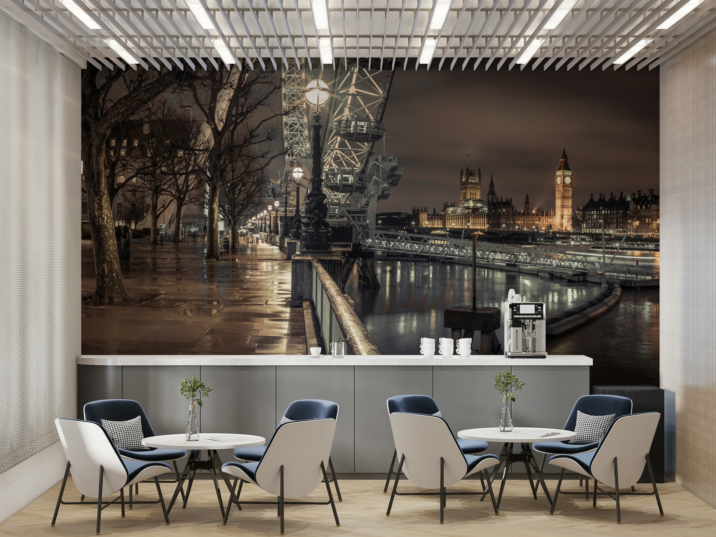Tranquil Thames River mural featuring London’s glowing lights.